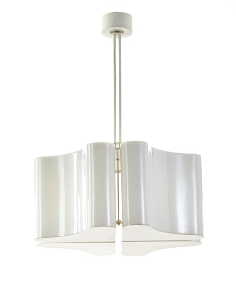 Lampada a sospensione “Pendant”. Produzione Stilnovo, Milano, anni '60. Struttura in acciaio e metallo verniciato bianco, diffusore in metacrilato opalino. Marcata a incussione sul metallo. (h cm 95; d cm 62) (lievi difetti)