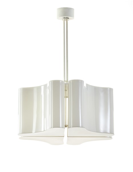 Lampada a sospensione “Pendant”. Produzione Stilnovo, Milano, anni '60. Struttura in acciaio e metallo verniciato bianco, diffusore in metacrilato opalino. Marcata a incussione sul metallo. (h cm 95; d cm 62) (lievi difetti)