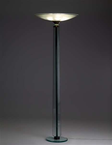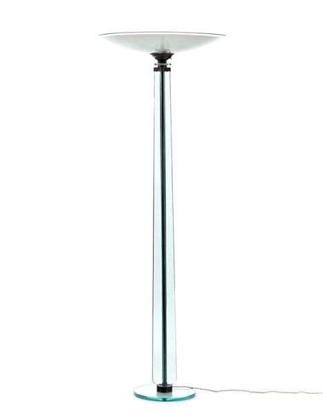 Lampada da terra con struttura in ottone, base e fusto in lastre di cristallo molato, disco diffusore in cristallo molato sabbiato sulla superficie interna e inciso con motivi vegetali. Italia, secolo XX. (h cm 185; d cm 65) (lievi difetti)