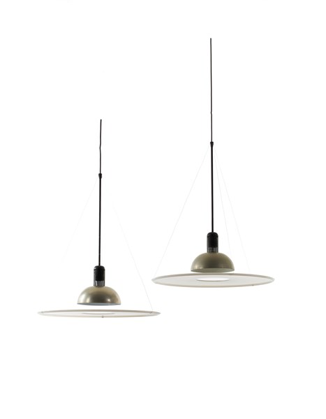 Coppia di lampade a sospensione modello "Frisbi". Produzione Flos, Milano, 1978. Polimetilmetacrilato opalino e metallo cromato. (d cm 60) (difetti)