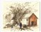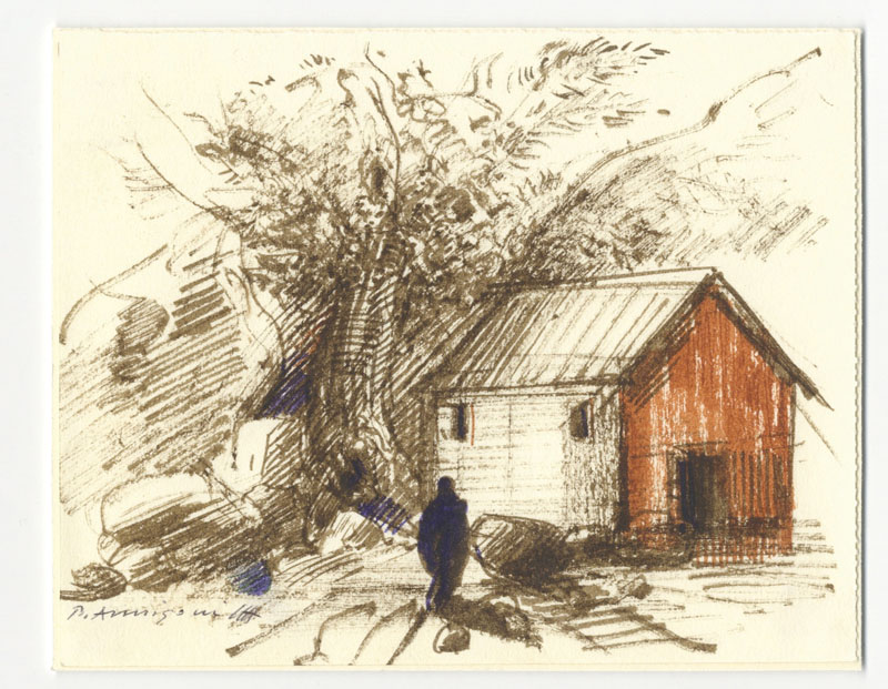 Pietro Annigoni (1910-1988). Paesaggio con uomo e casa. Penna e inchiostro...