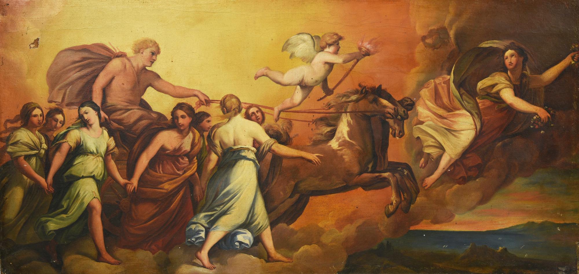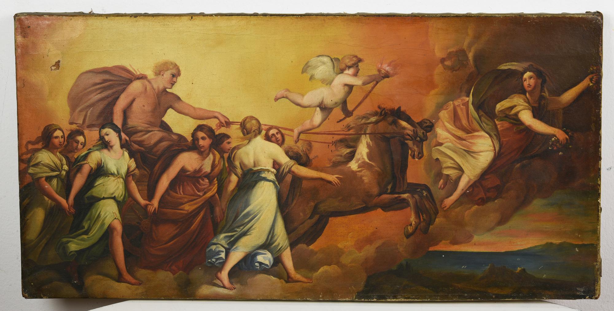Scuola del XIX secolo CARRO DELL'AURORA olio su tela, cm 30x55 Danni sulla tela