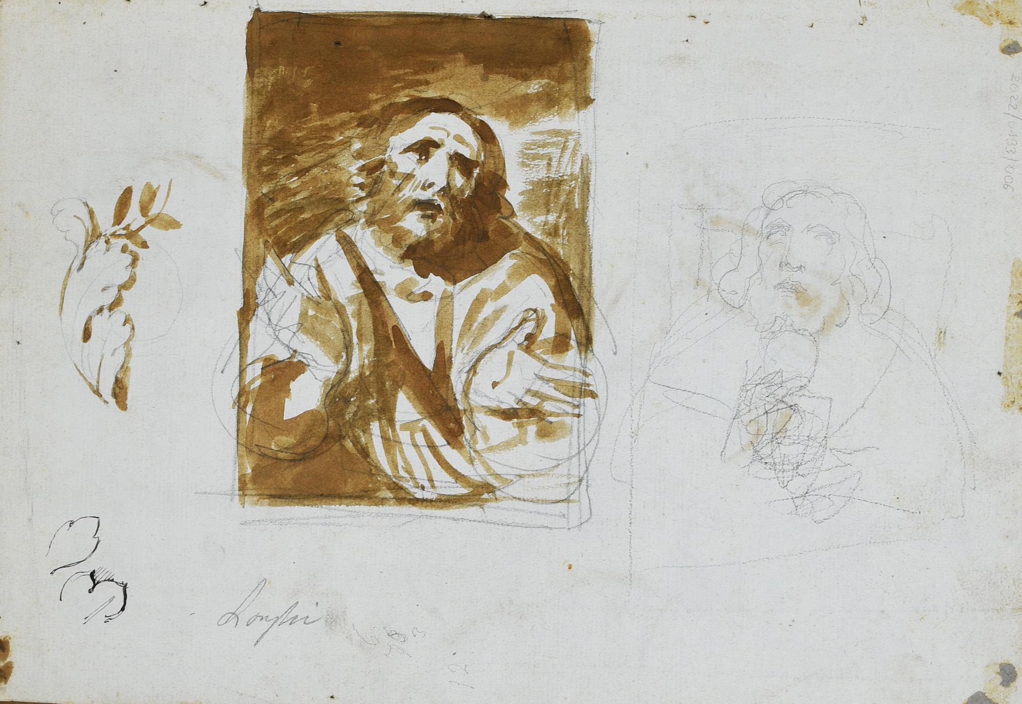 sul retro: bozzetto di santo ad inchiostro acquerellato e piccolo studio a matita