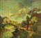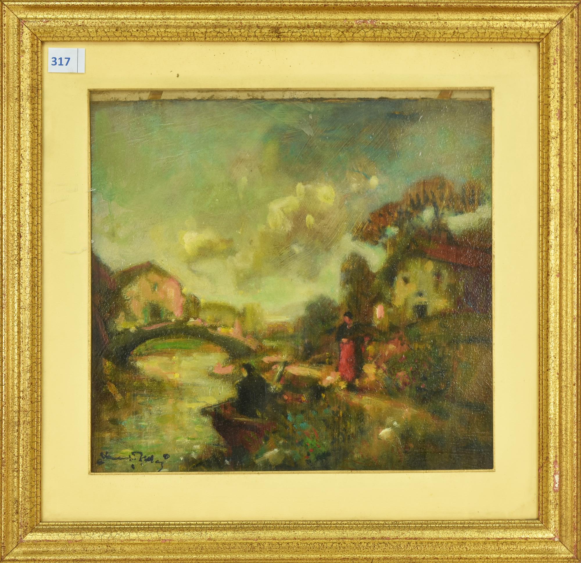 Venanzio Zolla VEDUTA CON PONTE E FIGURE olio su cartone, cm 46x48 firma