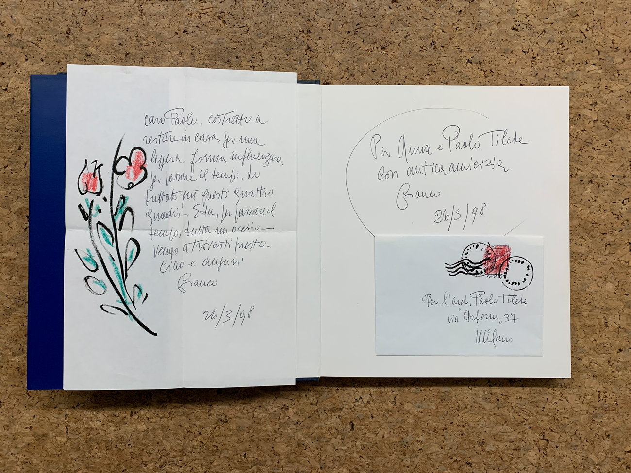 All'interno del catalogo è altresì presente una busta contenente un foglio A4 recante firma, una sentita dedica e un disegno a pennarello nero e pastelli colorati di Franco Rognoni