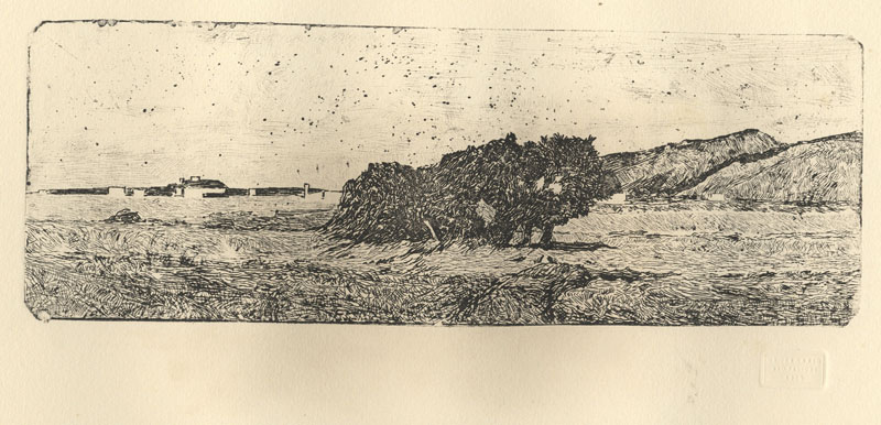 Giovanni Fattori (1825-1908). Castiglioncello. Seconda metà del XIX secolo. Acquaforte su zinco mm. 87x235. Foglio: 385x510. BABONI-MALESCI, tav. LIII. Timbro a secco "Centenario Gio. Fattori 1925". Esemplare appartenente alla tiratura Benaglia, eseguita nel 1925 in occasione del centenario della nascita. Stampata su carta avorio con filigrana, margini intonsi.