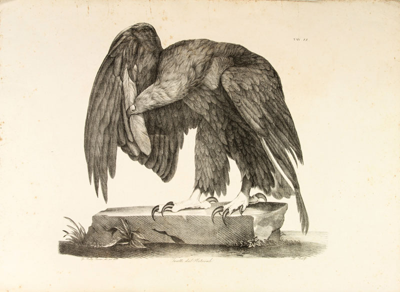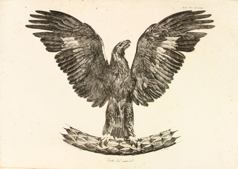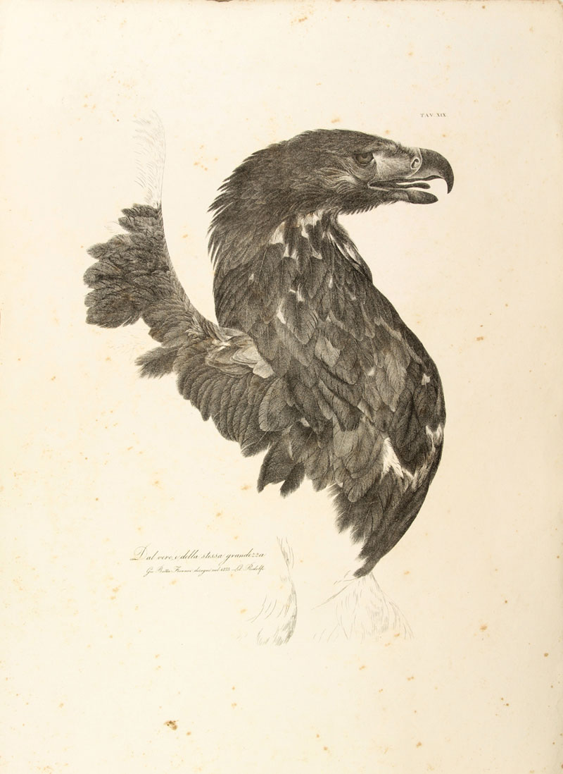 Giovanni Battista Ferrari (prima metà del XIX secolo ). Lotto di 3 stampe raffiguranti aquile ritratte dal vero. Firenze: Litografia Ridolfi, 1833. Litografie. mm 460x320; 370x440; 400x500. Fogli: mm 460x640. In basso a destra: "Gio. Batta. Ferrari del. nel 1833". In basso a destra: "Lit. Ridolfi". Sottotitolate in basso al centro: "Tratto dal vero", la prima: "Dal vero e della stessa grandezza". Numerate rispettivamente tav. XIX, XX e XXI. Sporadiche tracce di foxing, margini intonsi.