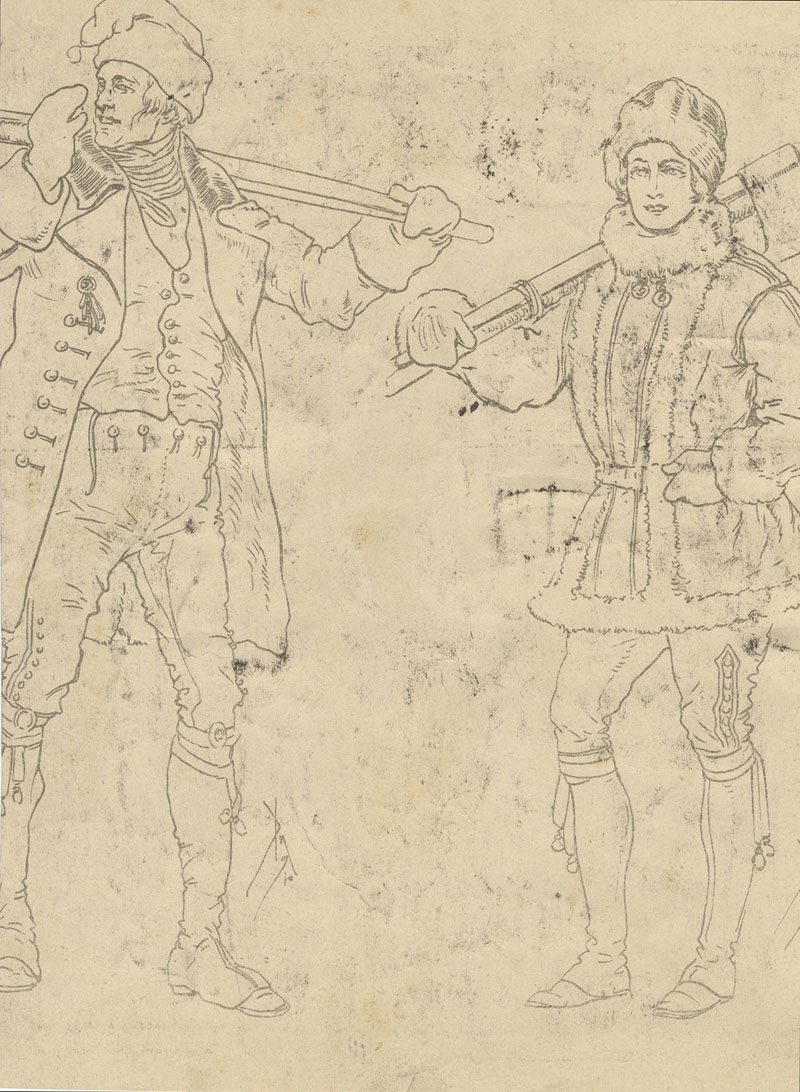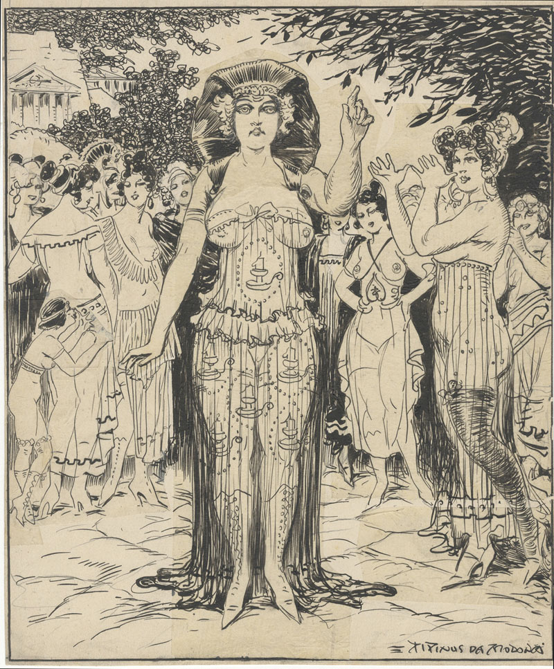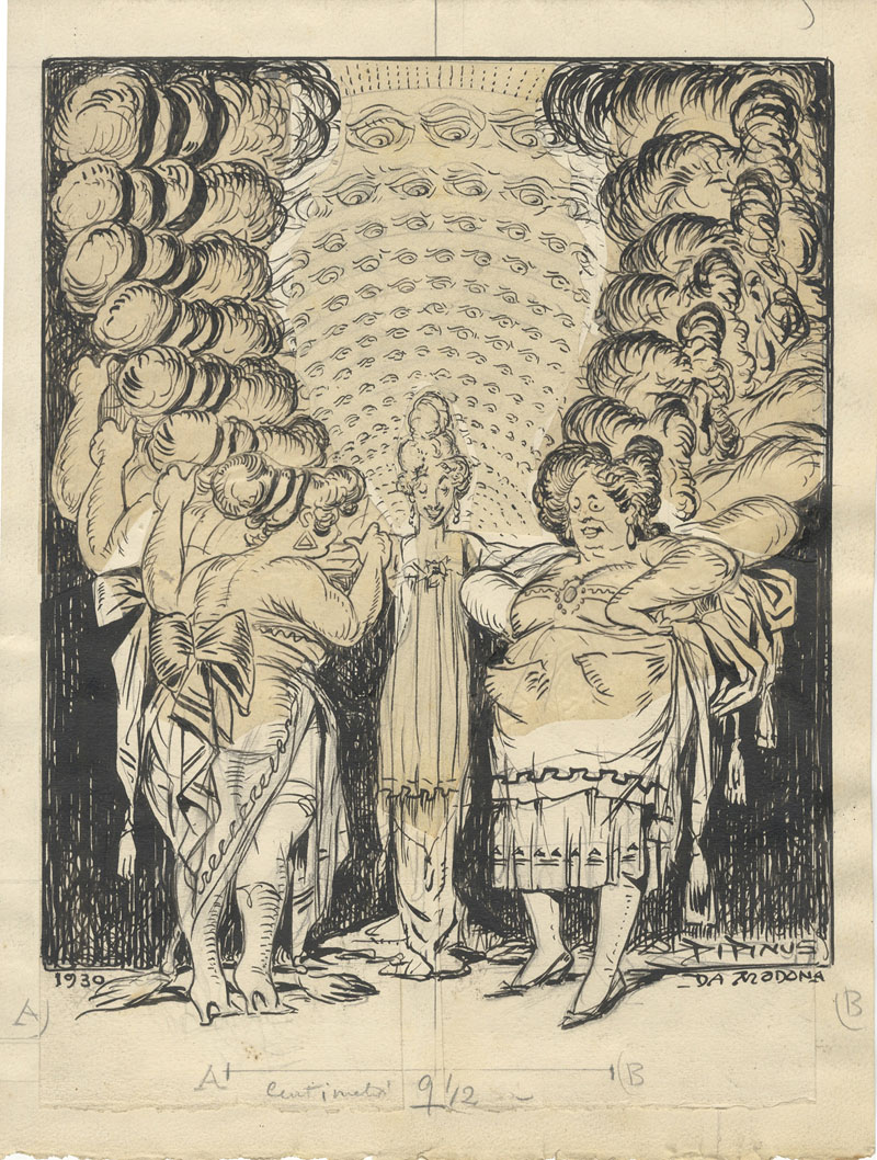 Giuseppe Garuti (detto Pipein Gamba) (1868-1954). Illustrazioni per l'Eneide. 1901-1930. Serie di 38 disegni a china su carta avorio e veline incollate tra tavole, testate e finali di misure varie (mediamente mm. 280x200) ai quali si aggiungono di dimensioni più grandi 2 illustrazioni (mm. 300x235; 375x310) e 4 fogli con cornici decorative figurate (di cui una tipografica) (mm. 635x455; 460x320) disegnati anche al verso con figure in costume rinascimentale destinate ad altro lavoro. Quasi tutti i disegni sono firmati con lo pseudonimo "Pipinus da Modona" e diversi datati 1901, 1902 e qualcuno 1930. Su diversi fogli annotazioni di mano dell'artista per la trasposizione dei clichées tipografici. Più volte ristampata, nel 1928 fu fatta un'edizione a cura e spese dell'illustratore. Si uniscono: 2 edizioni del libro a stampa di Anonimo (Nicolò Bacigalupo), Eneide, testo originale d'un reduce troiano illustrato da Pipinus da Modona (Pipein Gamba), una s.n.t. (anni '20) e l'altra Genova, ediz. Valenti, 1974, in tiratura limitata di 1100 copie firmate dall'editore (es. n. 415), nelle quali confluirono buona parte dei seguenti disegni originali. In questo poema "eroicomico" la vena effervescente di Gamba mescola ai tipi classici figure femminili liberty e modernizzate dalle rotondità sensuali e ammiccanti. L'autore del testo parodistico in versi dialettali genovesi, rimasto a lungo anonimo, era in realtà Nicolò Bacigalupo, autore anche del poemetto Montecatini (1902), in cui descriveva la nota località termale, meta favorita della borghesia genovese, e ne approfittava per delineare tipi e macchiette caratteristiche, coadiuvato brillantemente dal tratto birichino del disegnatore Giuseppe Garuti, alias Pipein Gamba, alias Pipinus da Modona, ormai famoso per le sue donnine stile Belle Epoque, allora considerate provocanti. -