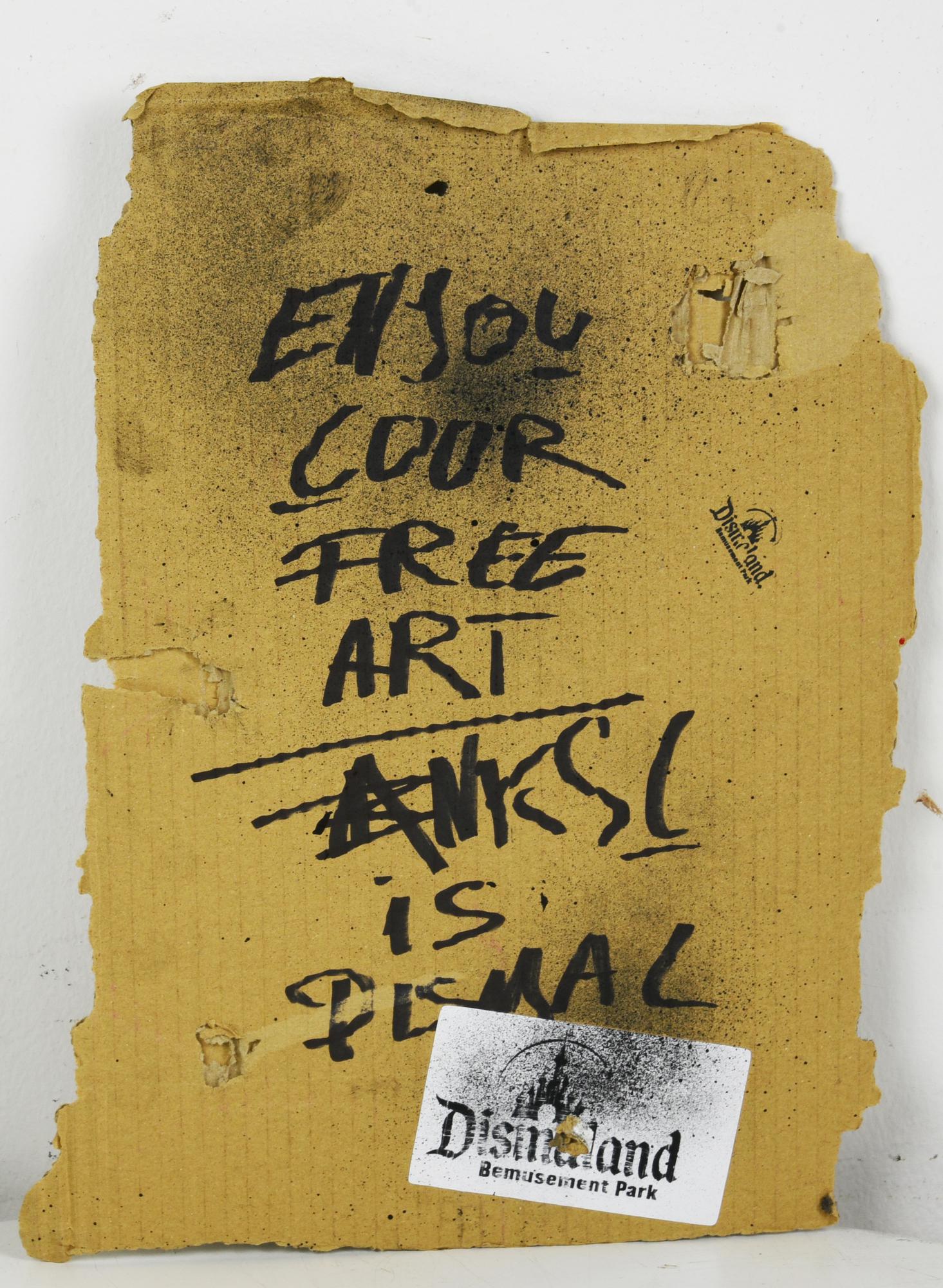 sul retro: timbro ed etichetta Dismaland, iscritto "enjoy your free art. Banksy is Dismal"
