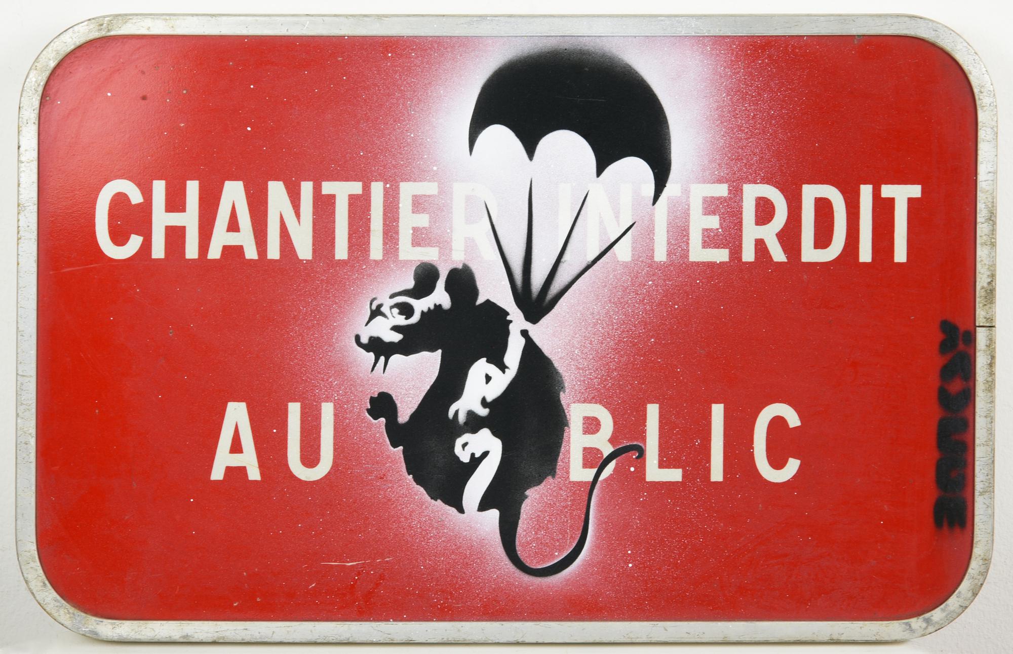 Da Banksy RAT PARACHUTE stencil print su cartello stradale, cm 32x53x3 firma...