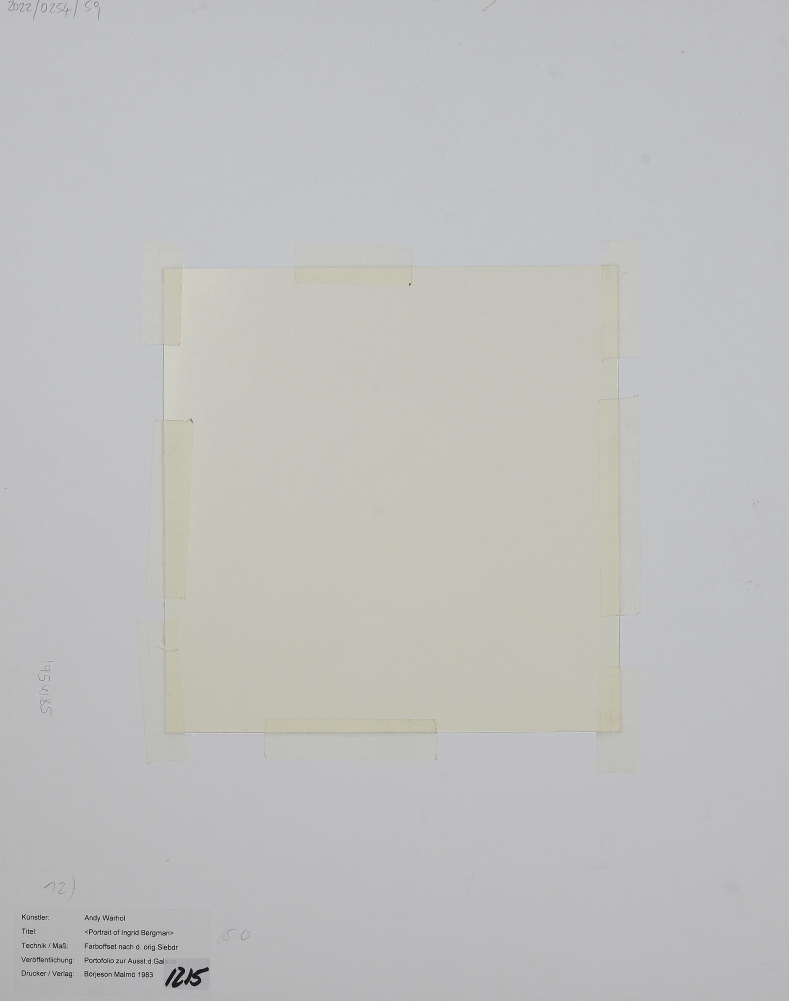 Proveniente dal catalogo: Andy Warhol, Portraits of Ingrid Bergam, Galerie Borjeson, Malmo