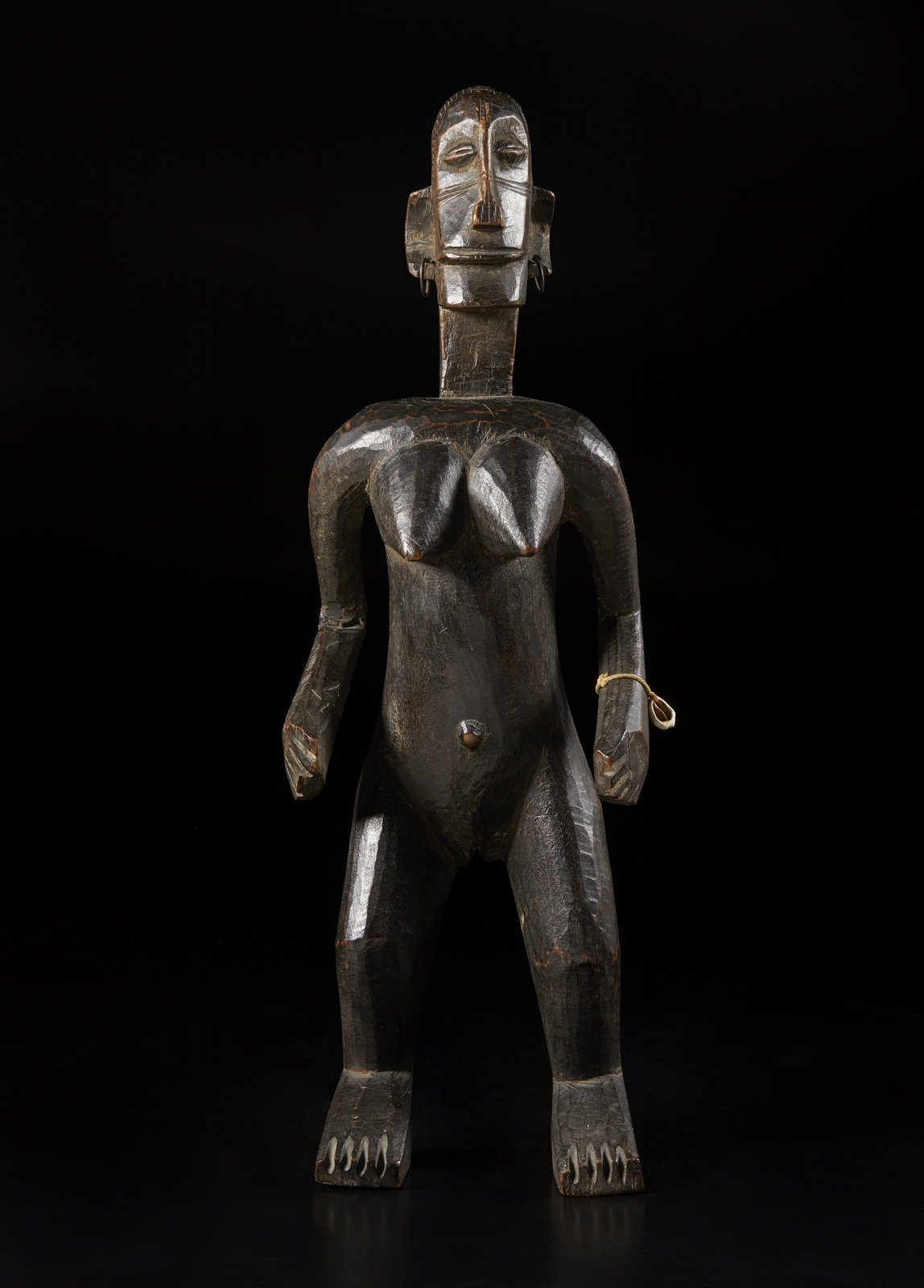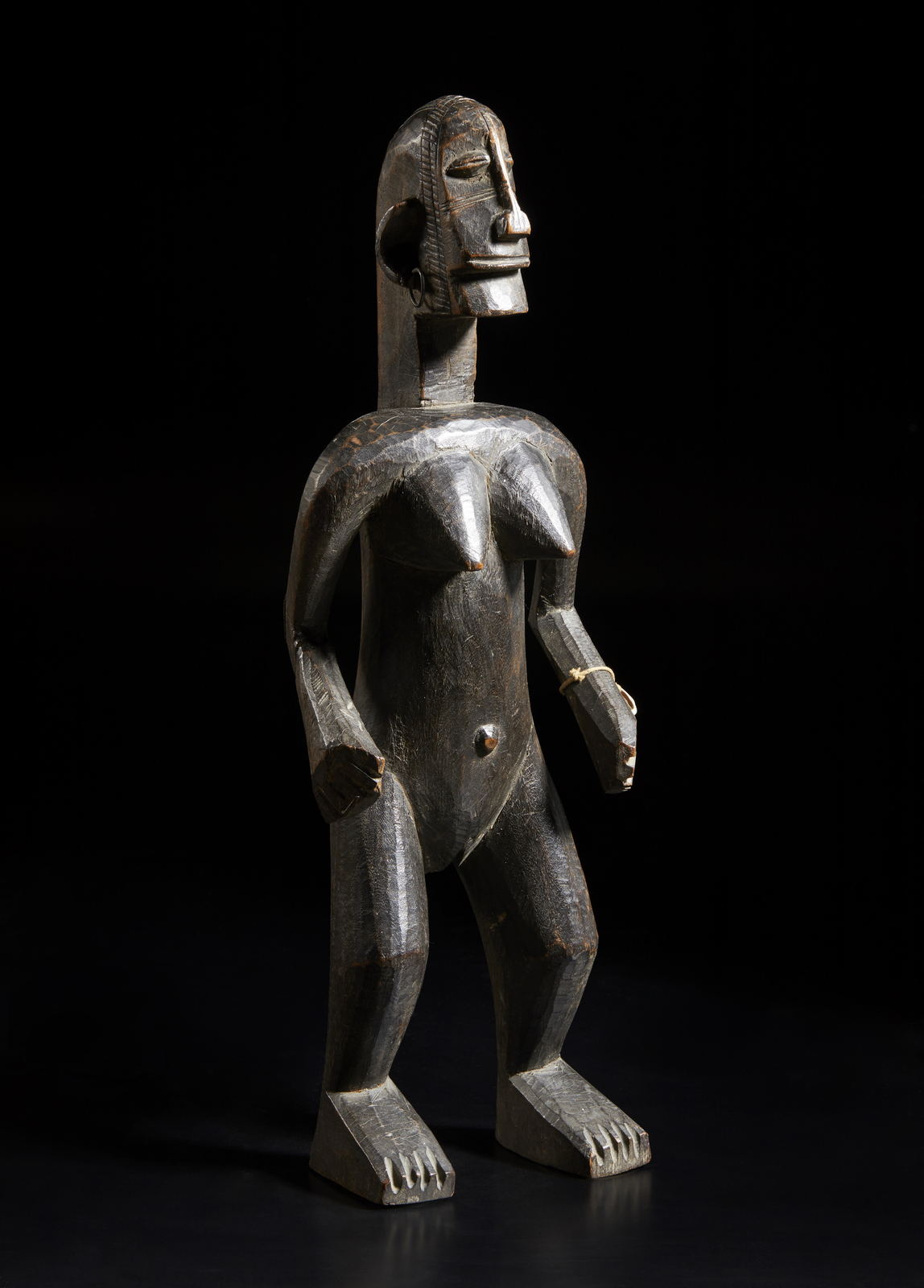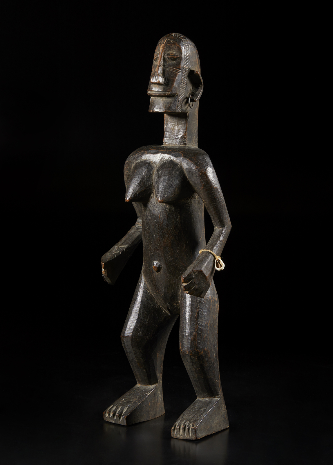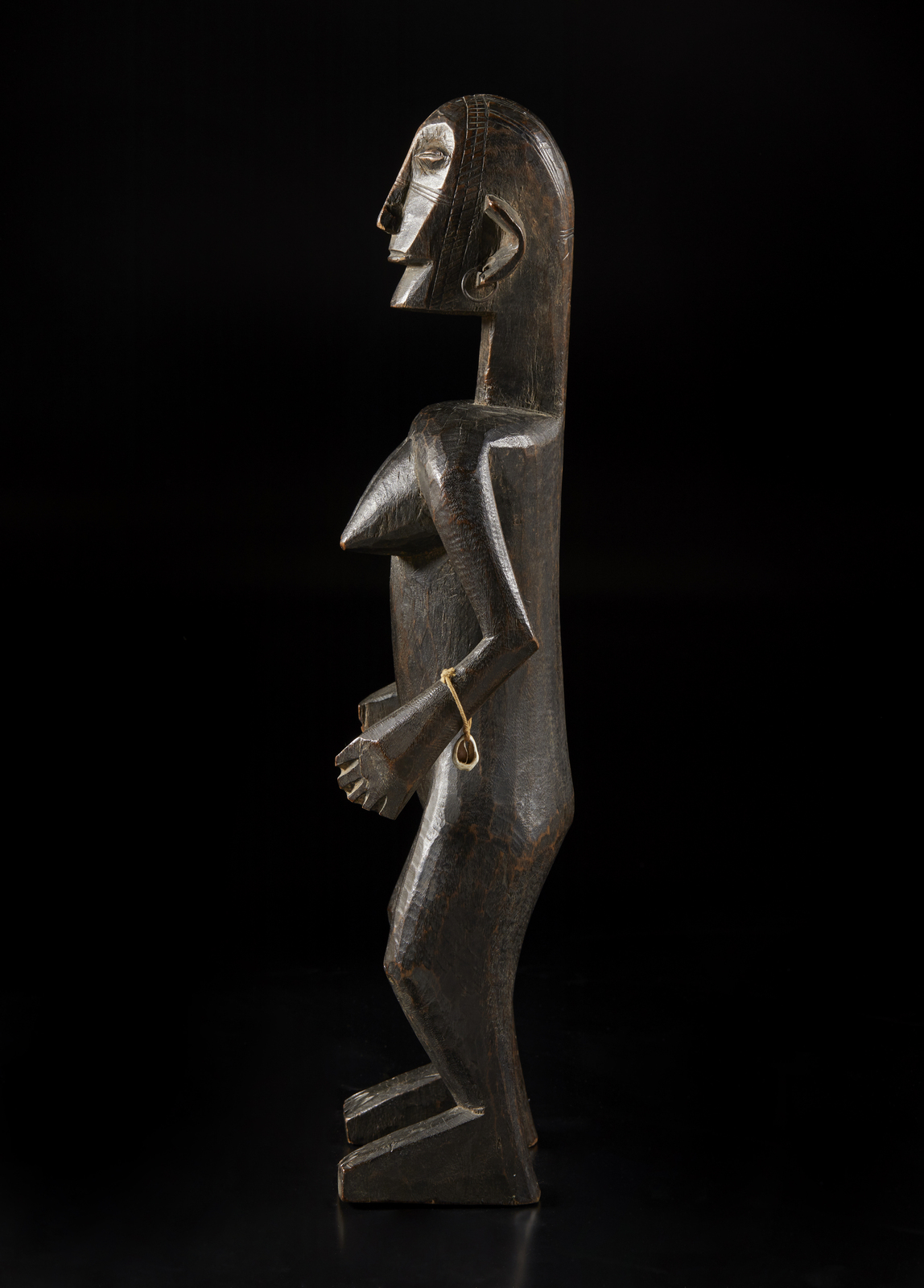 Arte africana - Mali - Bambara. Scultura femminile. Legno duro a patina scura, metallo, fibre e conchiglia. Difetti visibili e segni d'uso. .