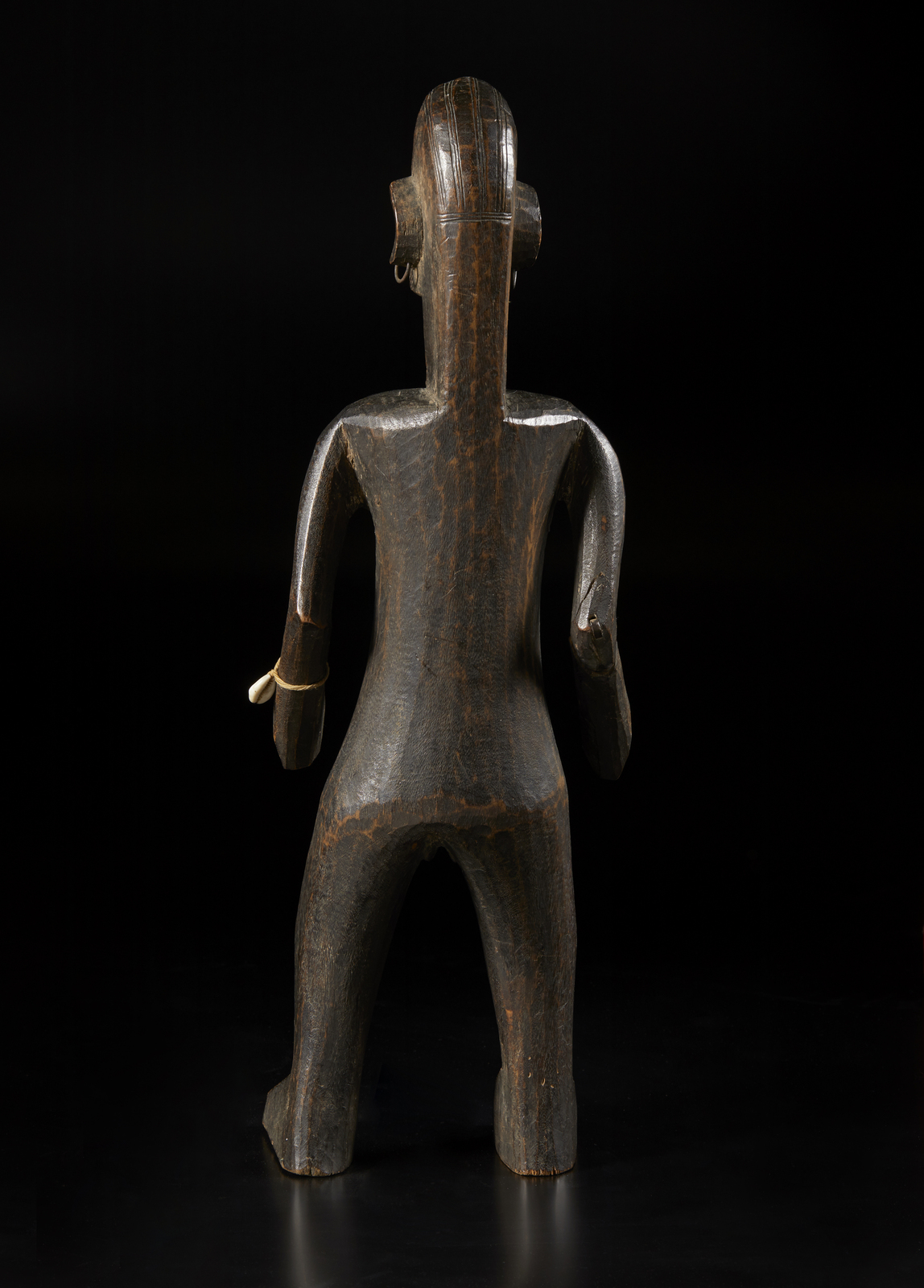 Legno duro a patina scura e lucida, Difetti visibili ed un interessante restauro indigeno al gomito destro. Segni d'uso.
