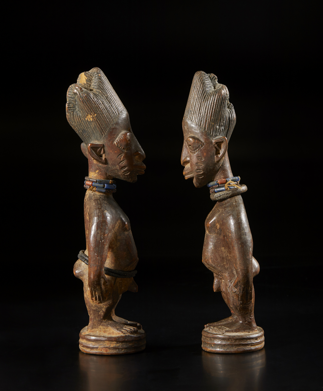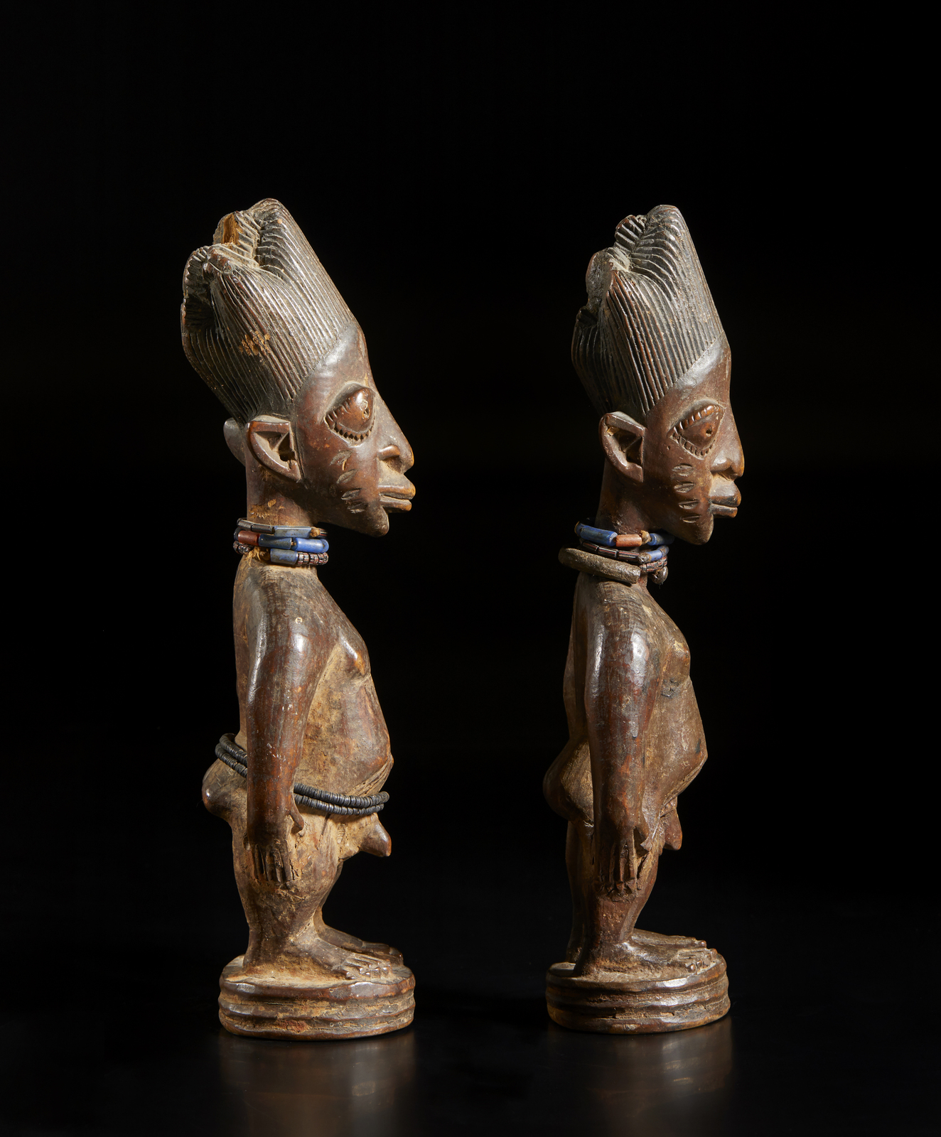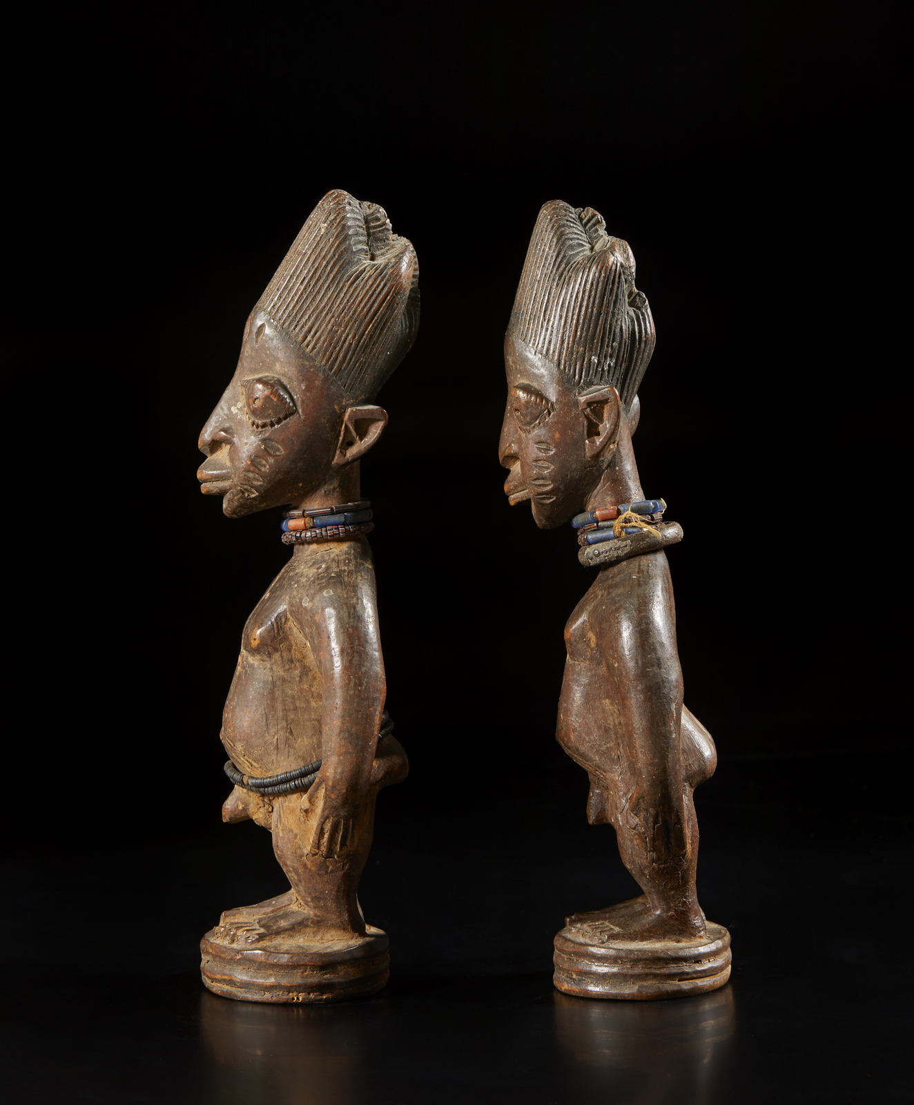 Belli per qualità d'intaglio, proporzioni classiche dei volumi, importanza delle scarificazioni, ricchezza e varietà del corredo di perline e bracciale in ottone, onesta patina ed evidenti segni d'uso, questa coppia di sculture Yoruba soddisfa appieno il gusto estetico del collezionismo occidentale più attento ed erudito.