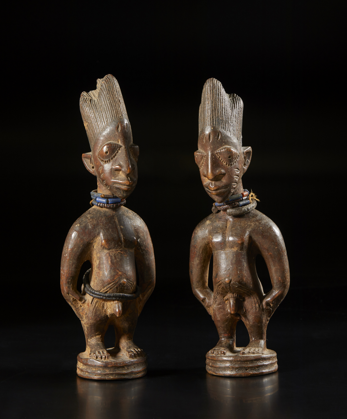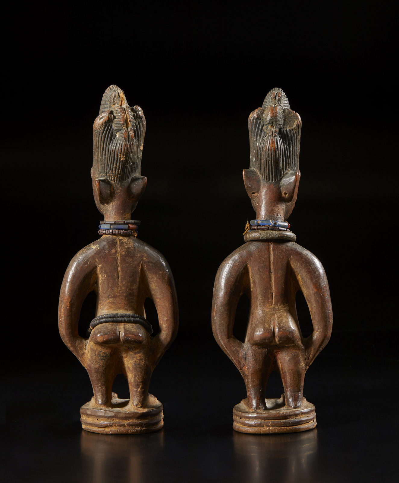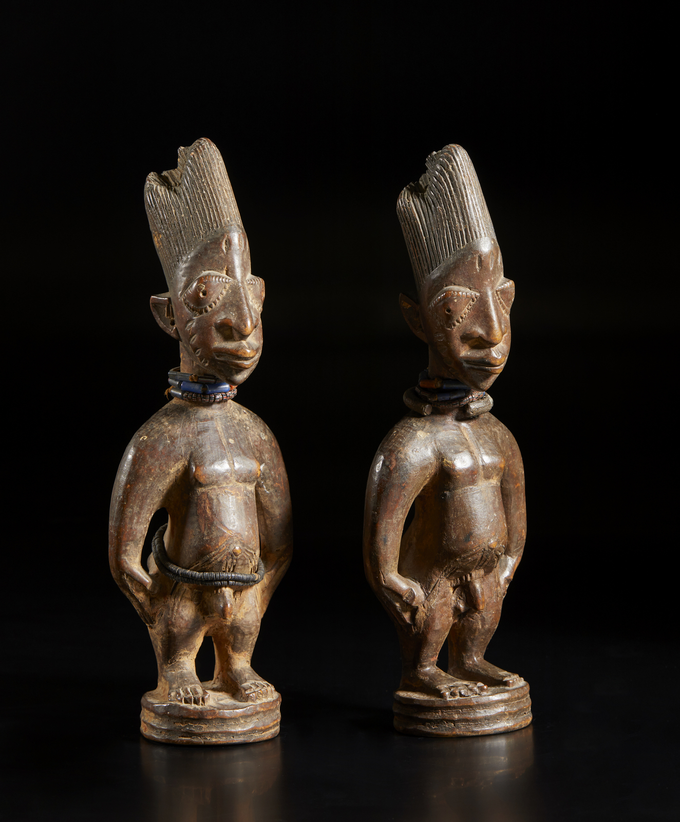 Belli per qualità d'intaglio, proporzioni classiche dei volumi, importanza delle scarificazioni, ricchezza e varietà del corredo di perline e bracciale in ottone, onesta patina ed evidenti segni d'uso, questa coppia di sculture Yoruba soddisfa appieno il gusto estetico del collezionismo occidentale più attento ed erudito.