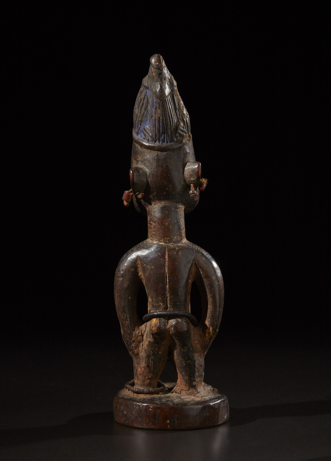 Arte africana - Nigeria - Yoruba. Scultura Ibeji. Legno duro a patina scura, fibre, perline e pigmenti. Difetti, segni d'uso ed etichetta di provenienza.