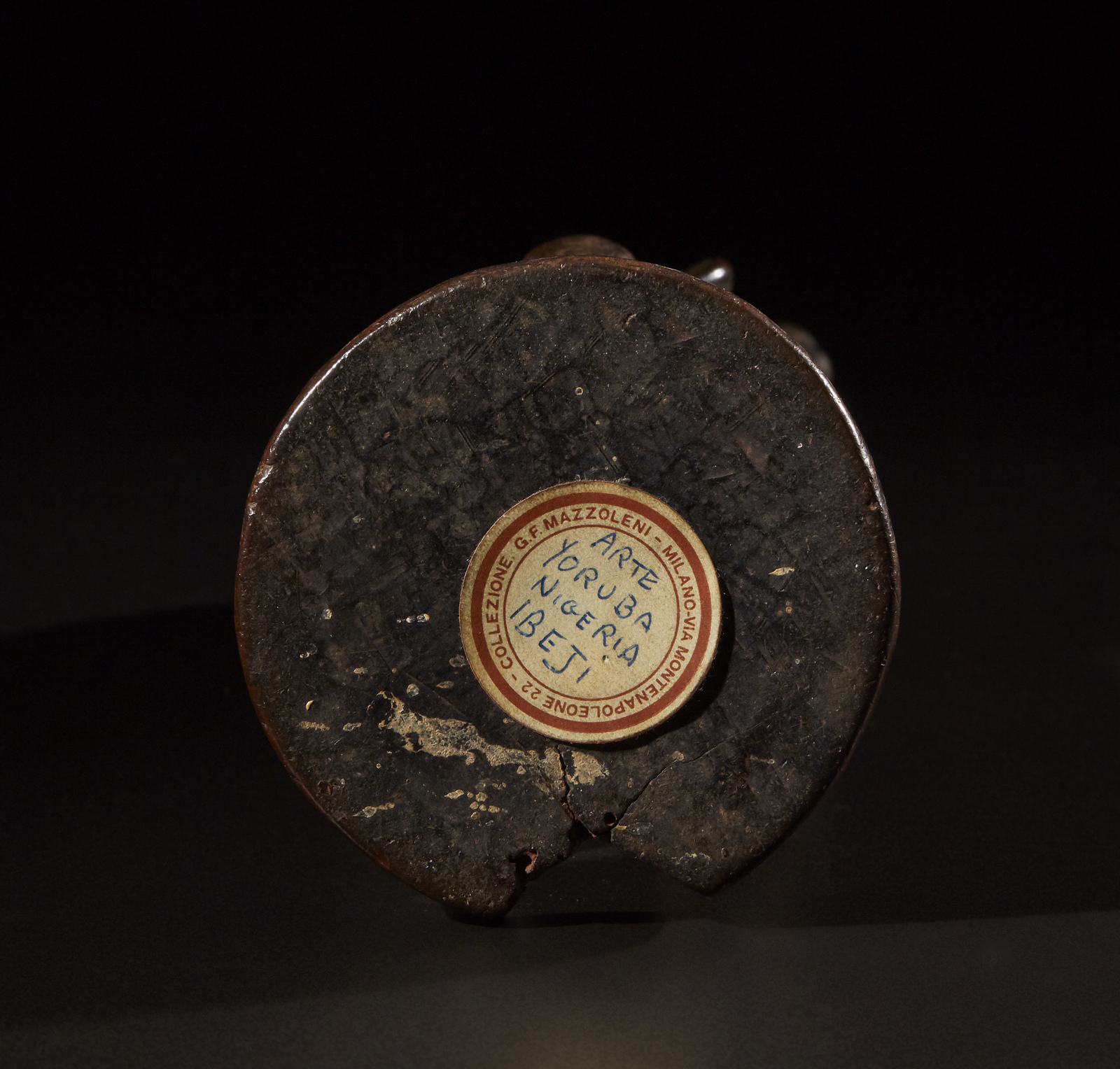Difetti, segni d'uso ed etichetta di provenienza. . Cm 8,00 x 26,00 x 7,00. Splendida scultura di gemello singolo Ibeji per raffinata quanto particolareggiata qualità d'intaglio, ottimo rapporto tra volumi come nel più puro stile classico Yoruba, antichità, magnifica patina ed ottima provenienza come testimoniato dall'etichetta di collezione Mazzoleni sulla base.