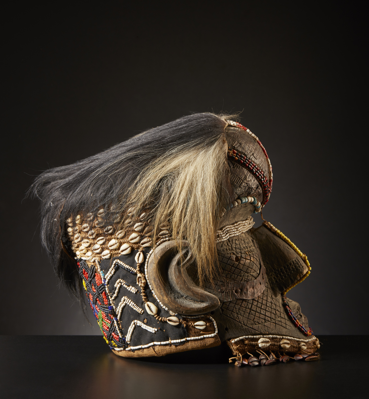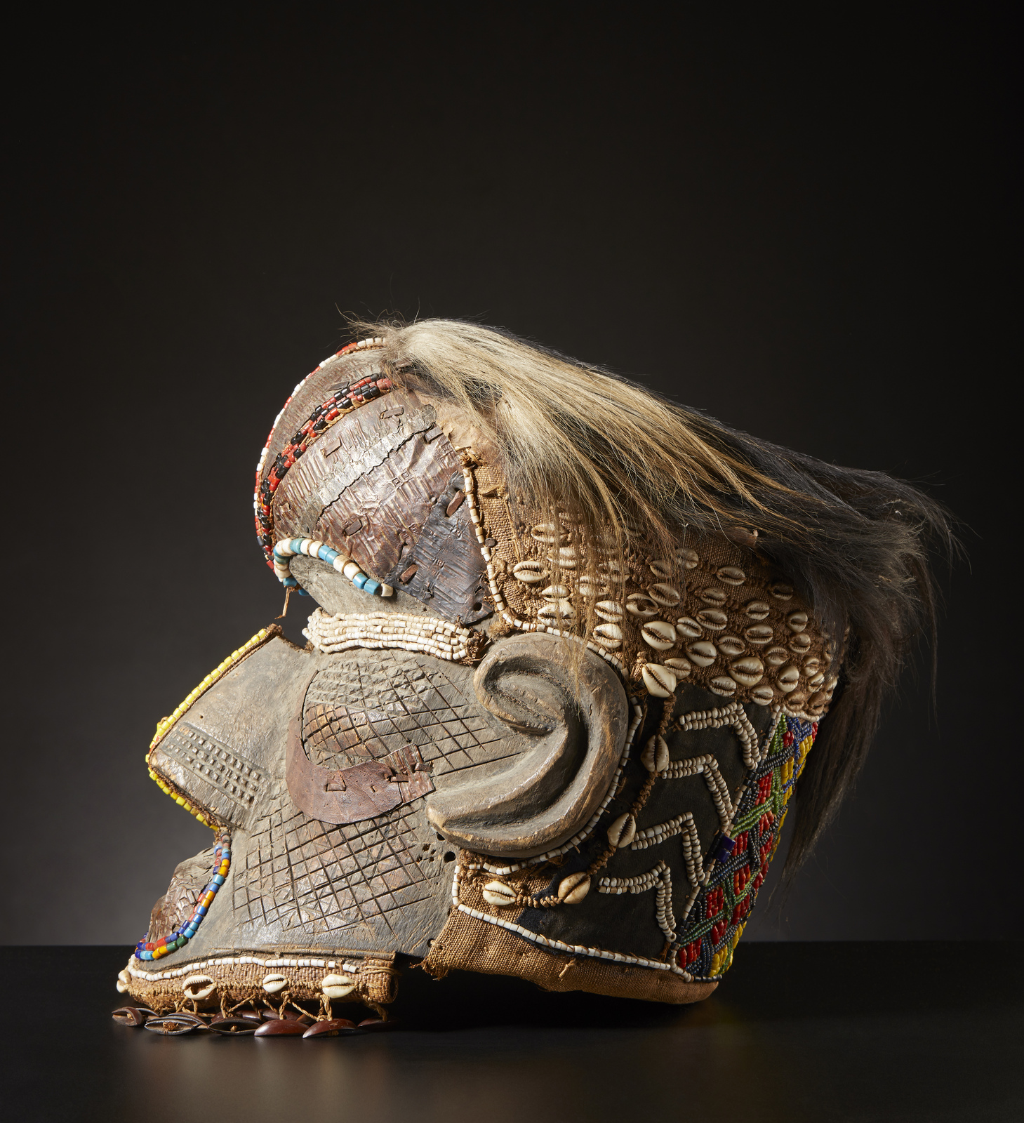Arte africana - Repubblica Democratica del Congo - Kuba. Maschera elmo Bwoom. Legno duro a patina naturale, metallo, tessuto, perline, conchiglie, semi e pelliccia animale. Segni d'uso.