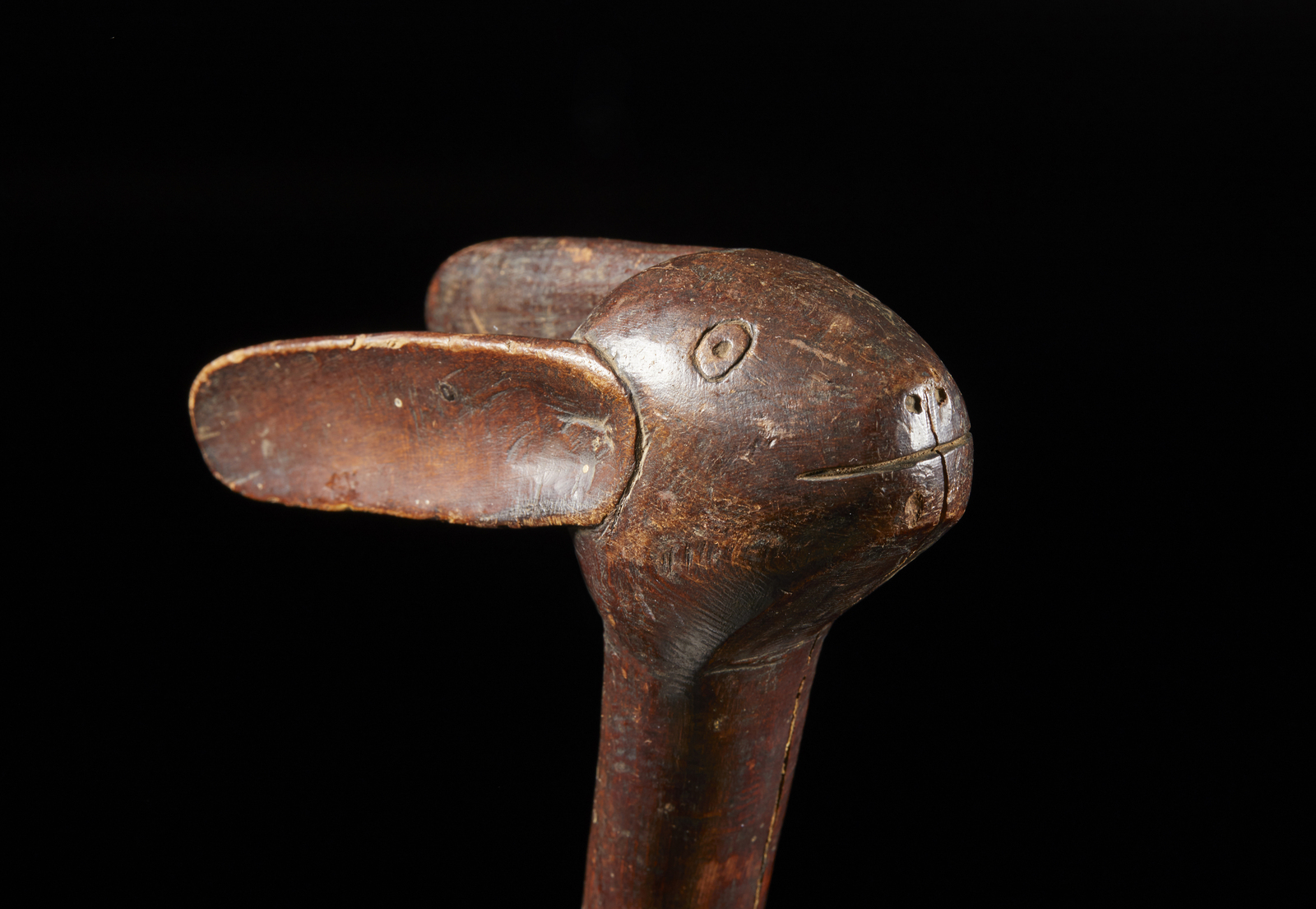 Segni d'uso. . Cm 14,50 x 69,00 x 5,50. Insegna di rango a forma di testa di lepre o coniglio, utilizzata con ogni probabilità poggiata sulla spalla ad indicare l'alto rango del dignitario che la portava, come nelle nostre citta il sindaco veste la fascia tricolore durante le cerimonie ufficiali.