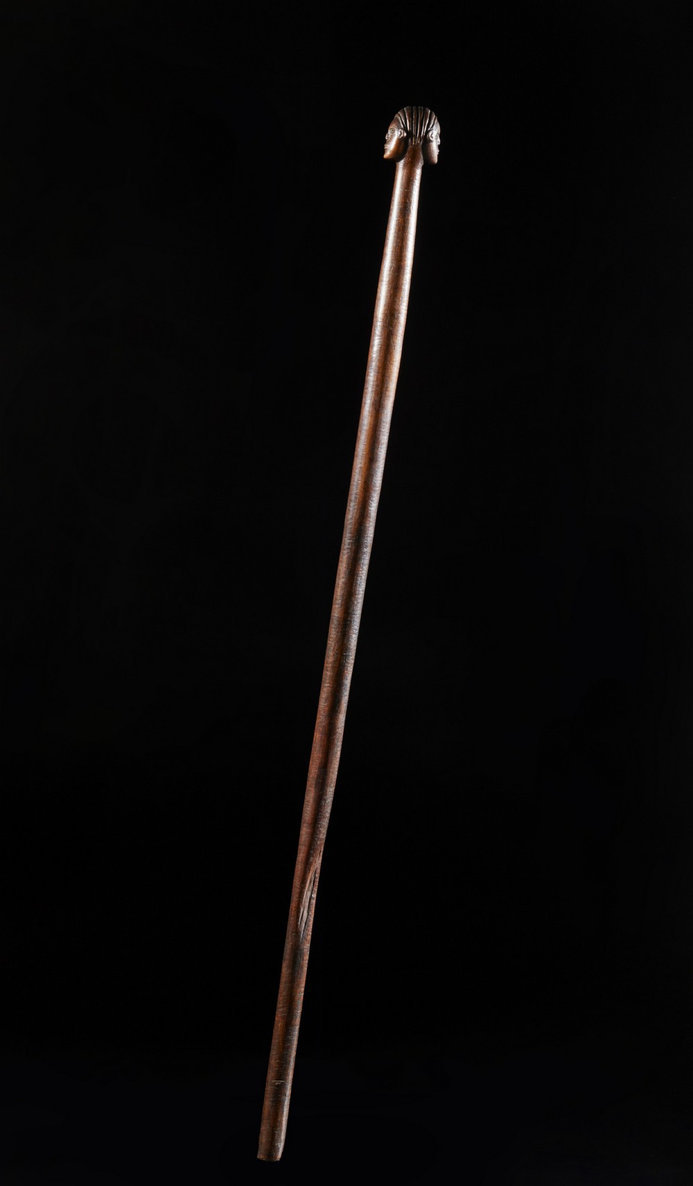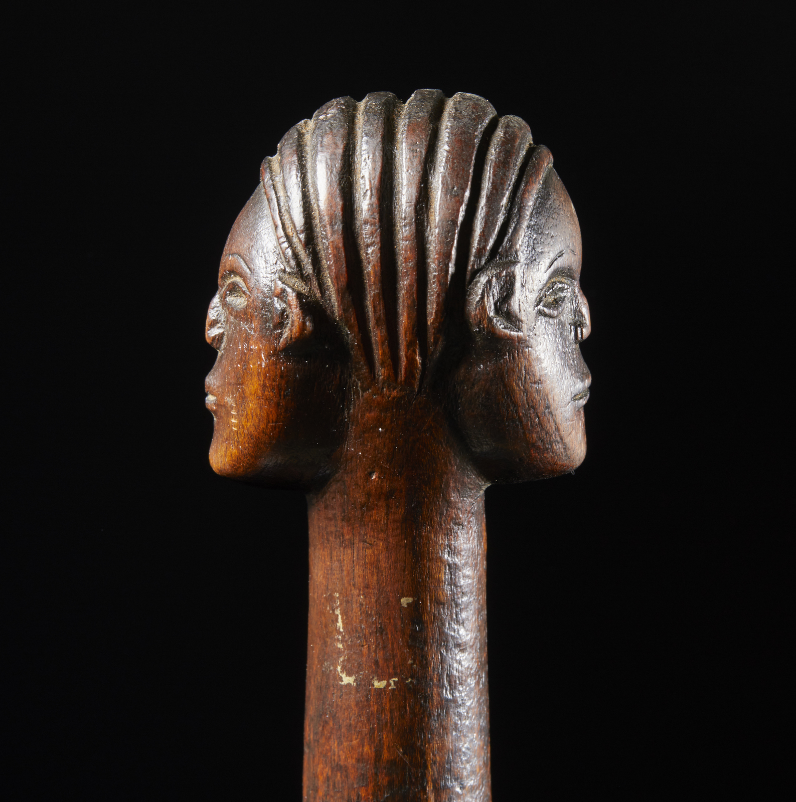 Difetti visibili e segni d'uso. . Cm 5,00 x 97,00 x 4,00. Bello il gioco speculare dei volti opposti con l'ottima soluzione di continuità sapientemente costruita con i capelli in comune dallo scultore nella visione del profilo di questo bastone/insegna di comando congolese.