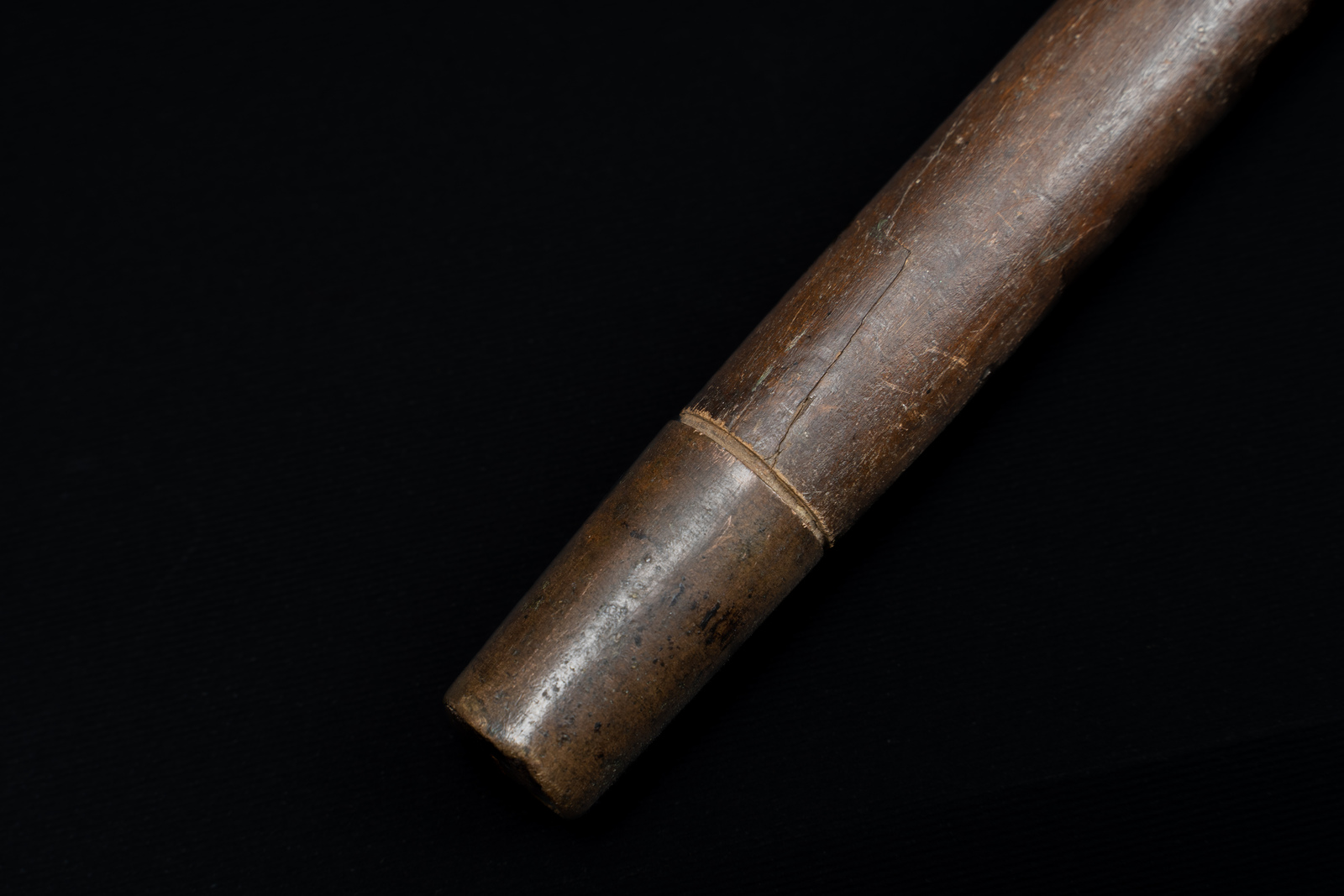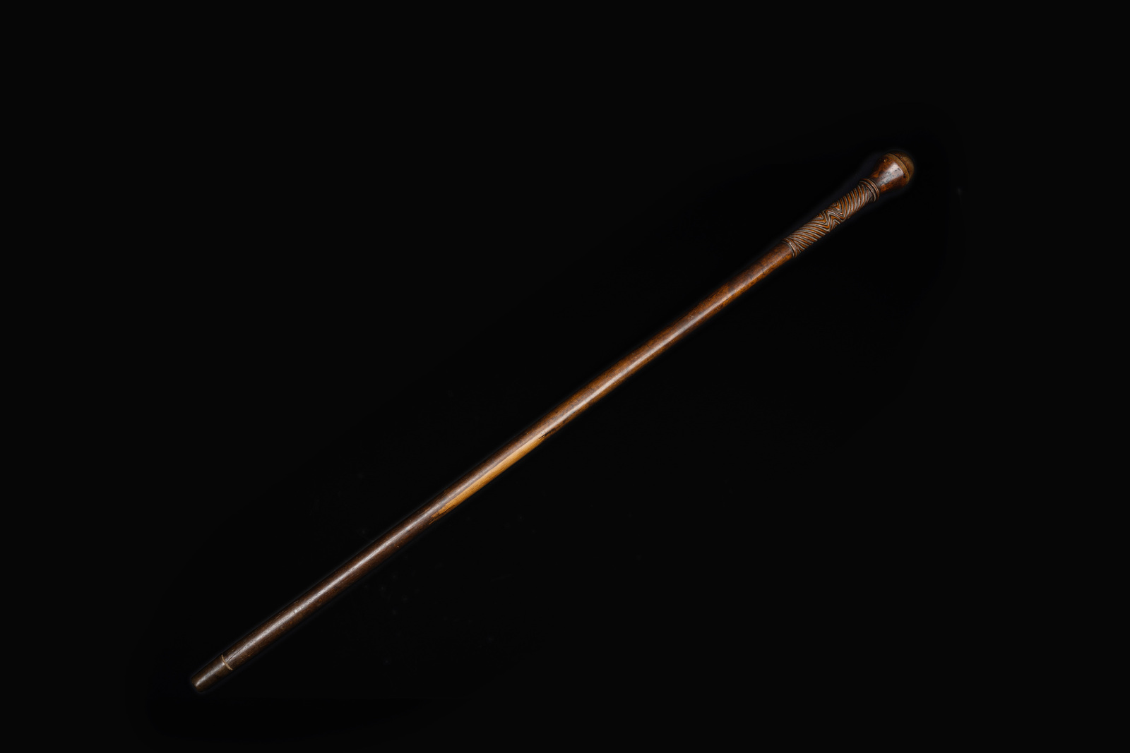 Le dimensioni di questo bastone ( l'altezza di oltre un metro), il piccolo pomello attraversato orizzontalmente da una linea incisa a rilievo oltre alla decorazione posizionata quasi come impugnatura alta, portano a pensare che questo oggetto sia stato realizzato non tanto come mazza da guerra, ma più come insegna di rango utilizzato da un avant-courier da un araldo per essere esibito in rappresentanza del capo o padrone.