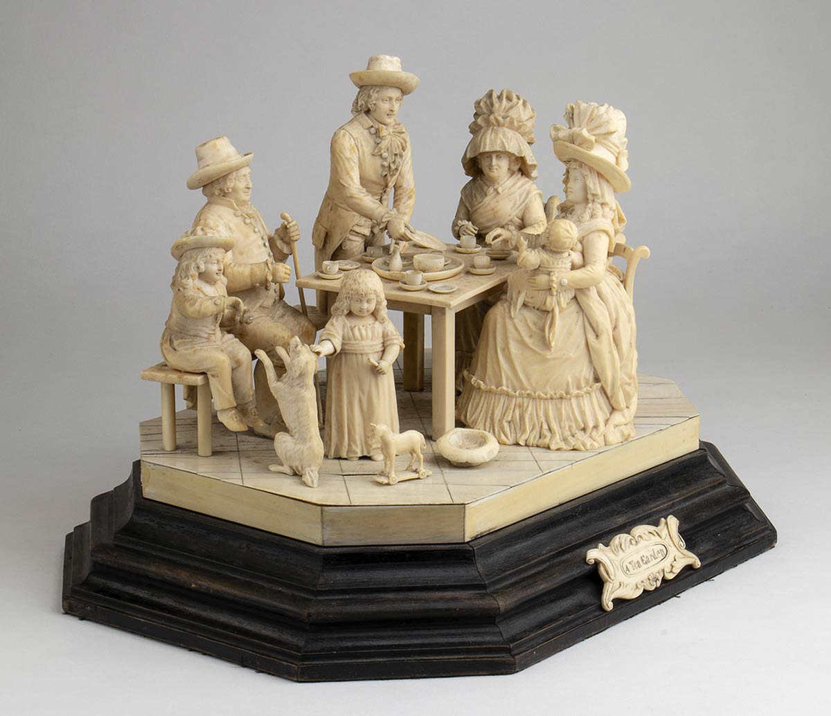 "Tea Garden", in avorio di elefante scolpito a tutto tondo (Loxodonta africana Blumenbach, 1797 o Elephas maximus Linnaeus, 1758), raffigurante una scena conviviale di una tipica famiglia inglese, riunita in giardino intorno ad un tavolo. Il titolo riportato nel cartiglio posto sul fronte centrale del basamento ligneo ci suggerisce la scena.