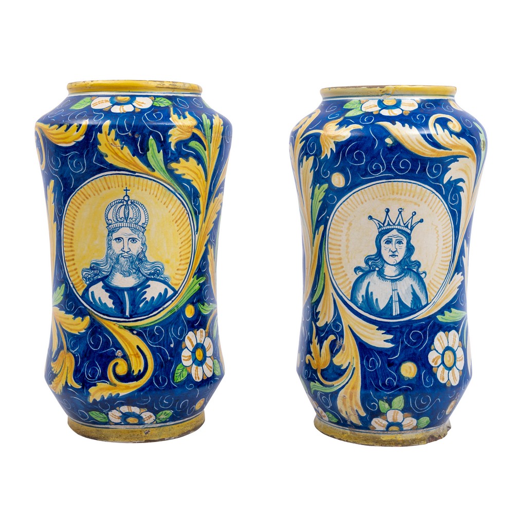 Coppia cilindri in ceramica smaltata e decorata con medaglioni centrali raffiguranti "Regnanti" (usure).