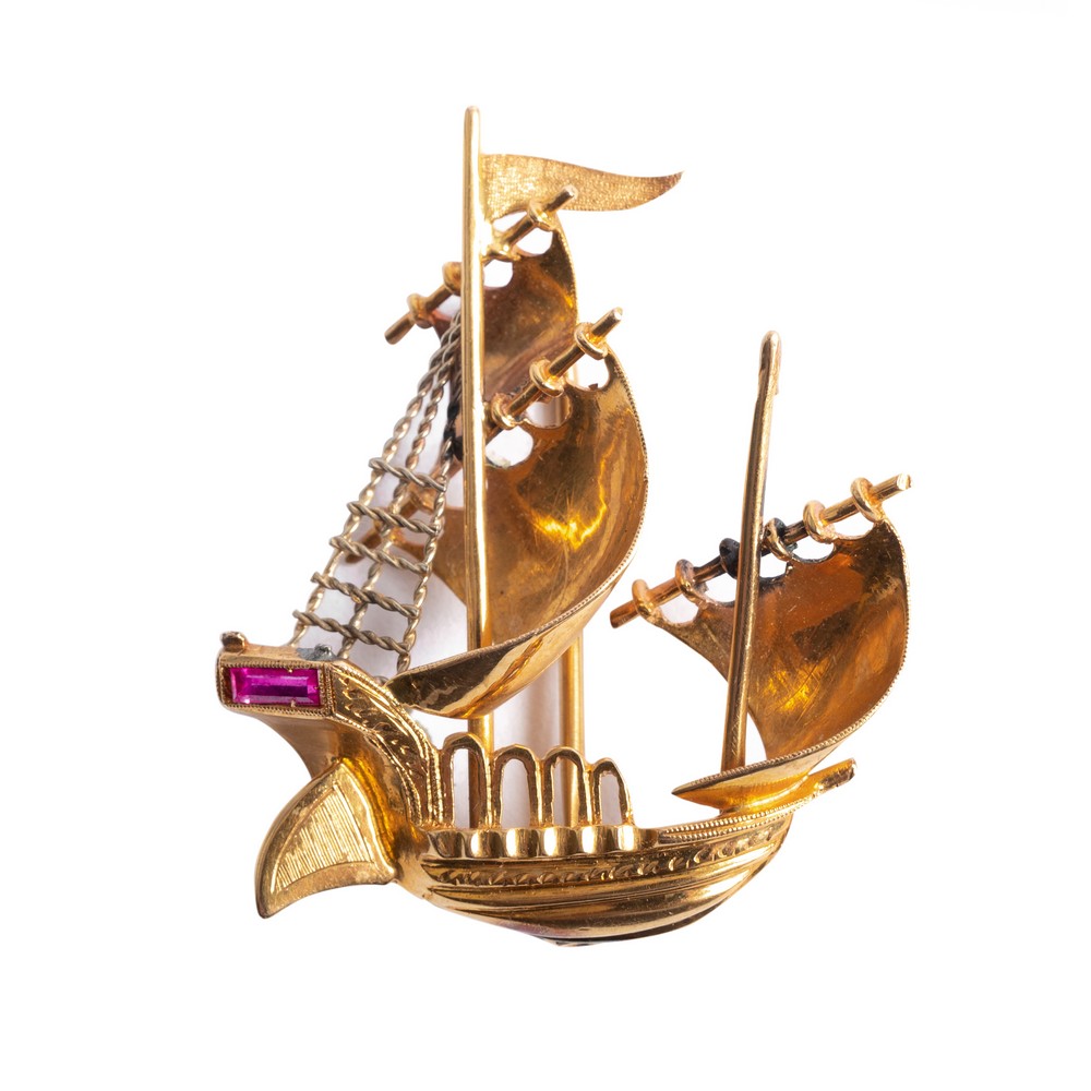 SPILLA a guisa di galeone in oro giallo 18 KT con rubino