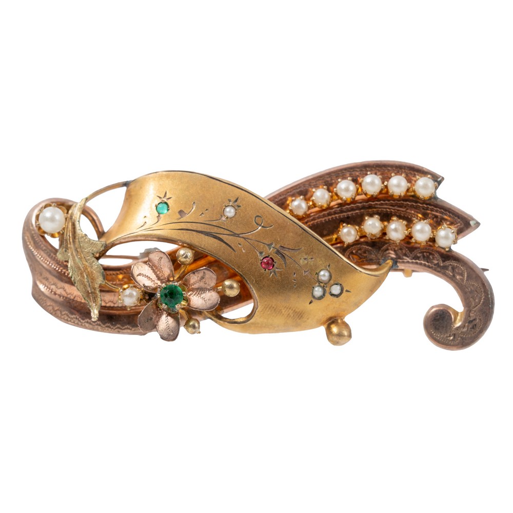 SPILLA in oro giallo 9 KT con smeraldi, rubino e perle