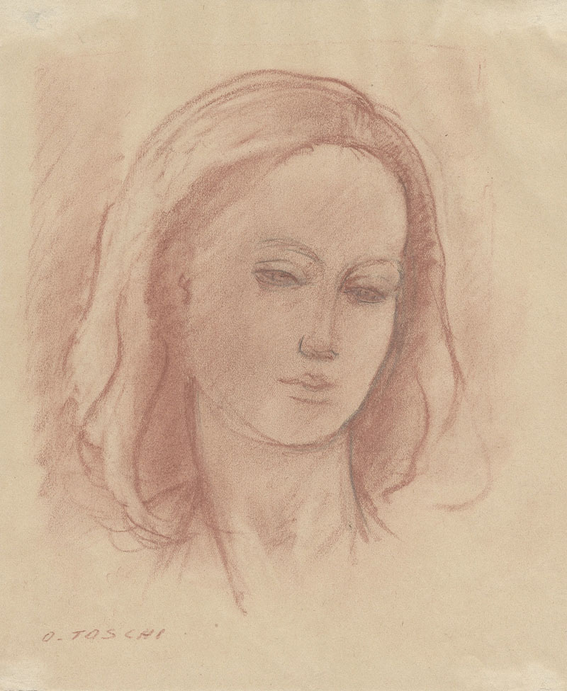 Orazio Toschi (1887-1972). Volto di donna. Matita rossa e matita di grafite su carta parzialmente applicata a cartoncino di supporto. mm 245x204. Firmato in basso a sinistra. Carta uniformemente ingiallita.