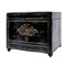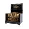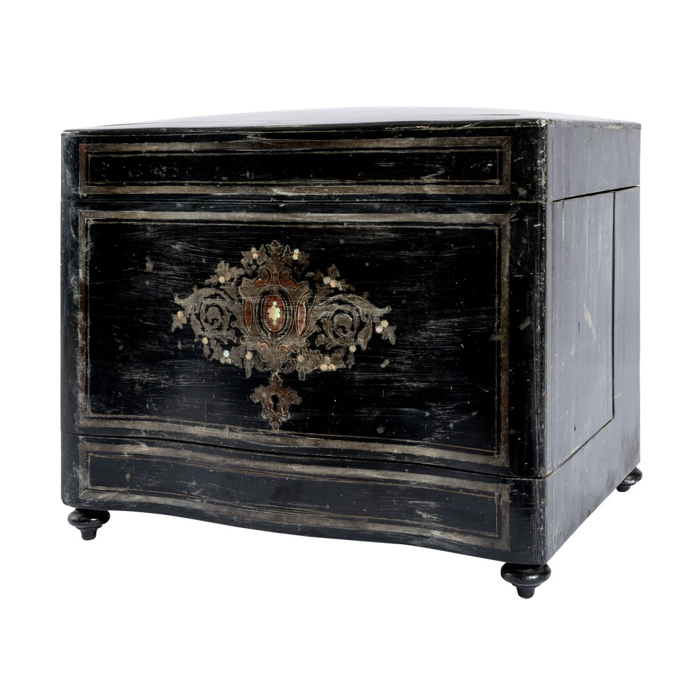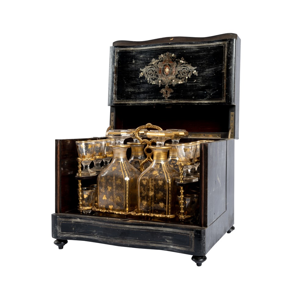 in legno ebanizzato con perfili in rame e madreperla con all'interno un servizio da rosolio in vetro con decoro in oro composto da quattro bottiglie e 14 bicchierini.