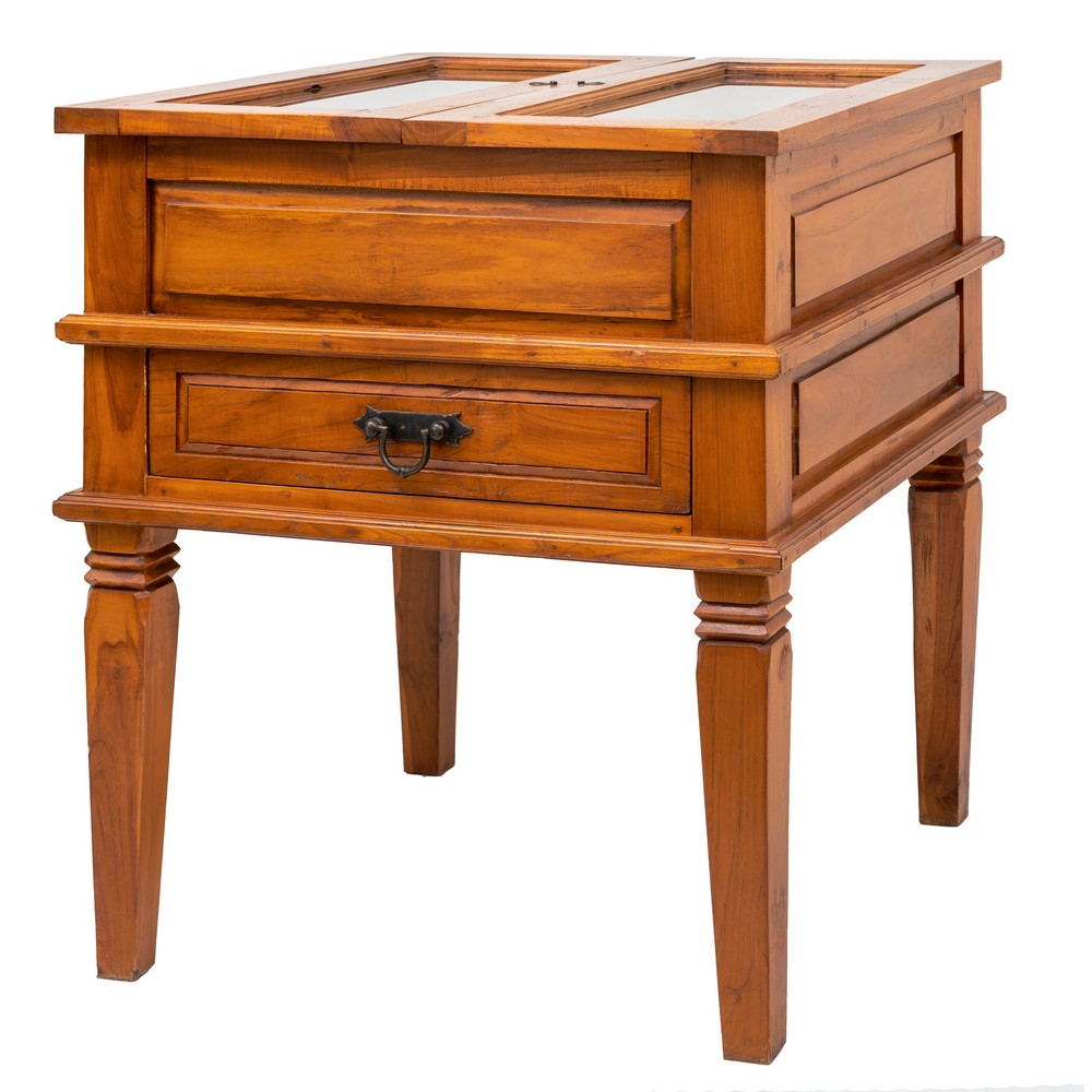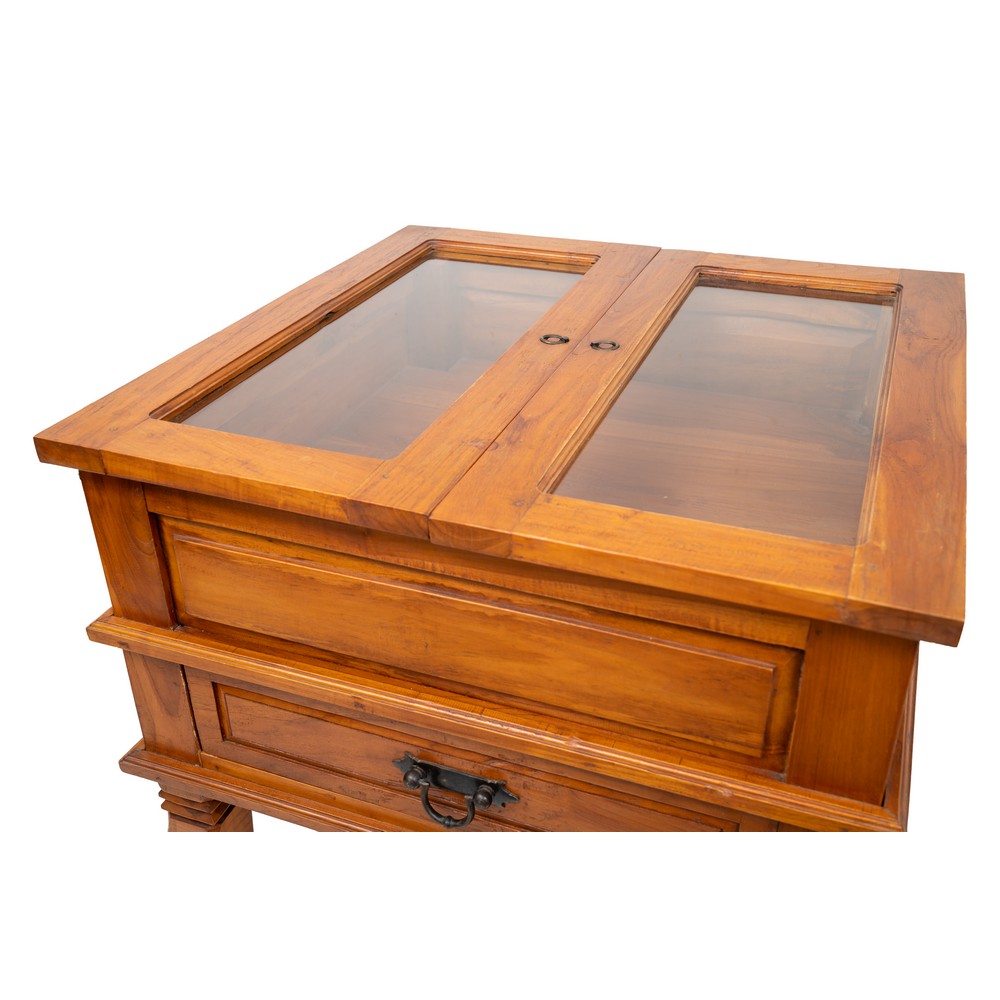 TAVOLO ESPOSITORE a libro di forma quadrata.
