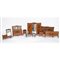 STANZA IN MINIATURA composta da cassettone a tre cassetti con specchiera, armadio a tre ante, due comodini, toletta, due poltrone, pouff ed un letto in radica di noce, mogano e perfili in bois de rose e bosso (restauri, mancanze e usure).