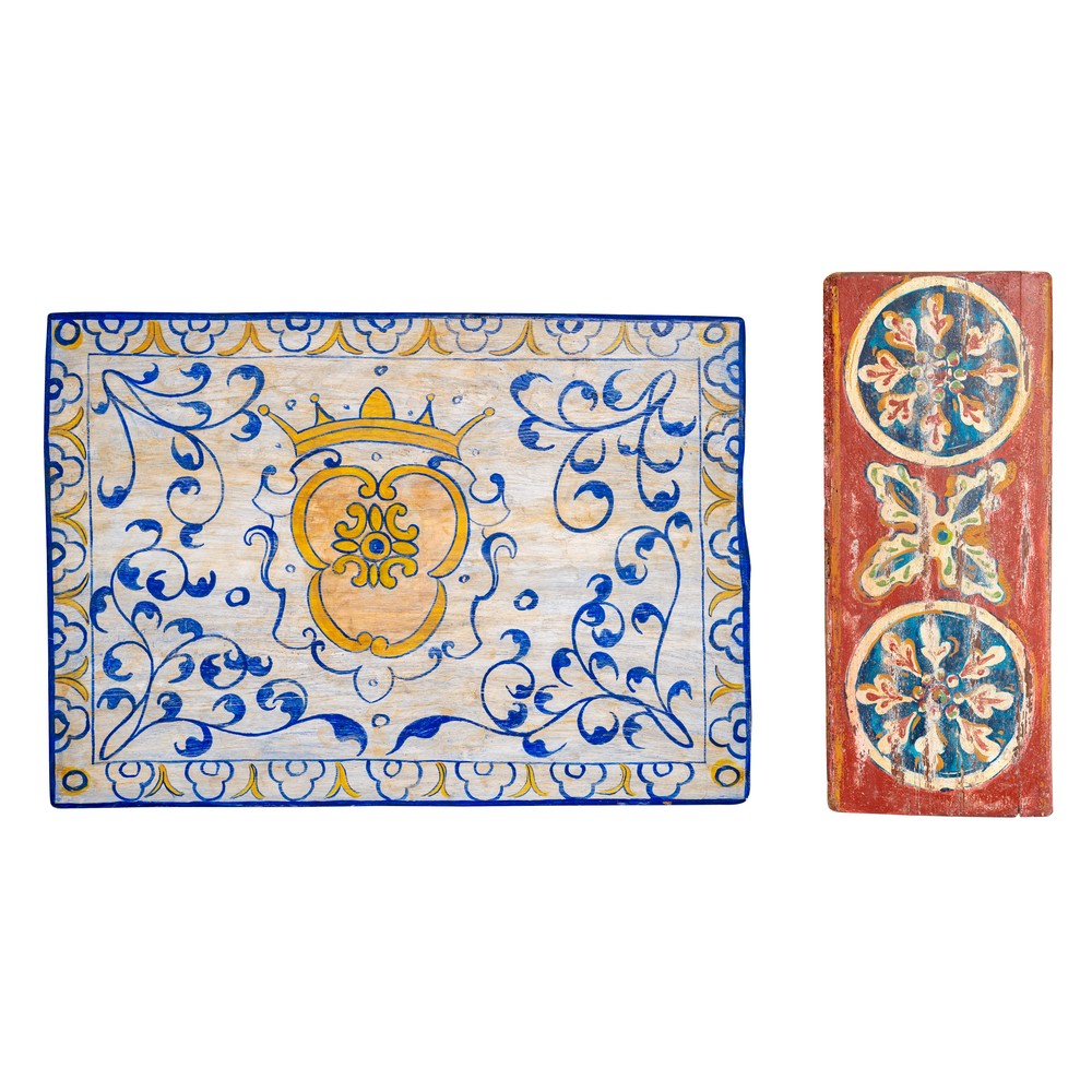 DUE PANNELLI in legno dipinto, uno raffigurante “ stemma nobiliare”, l’altro con decorazioni a motivo fogliaceo.