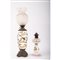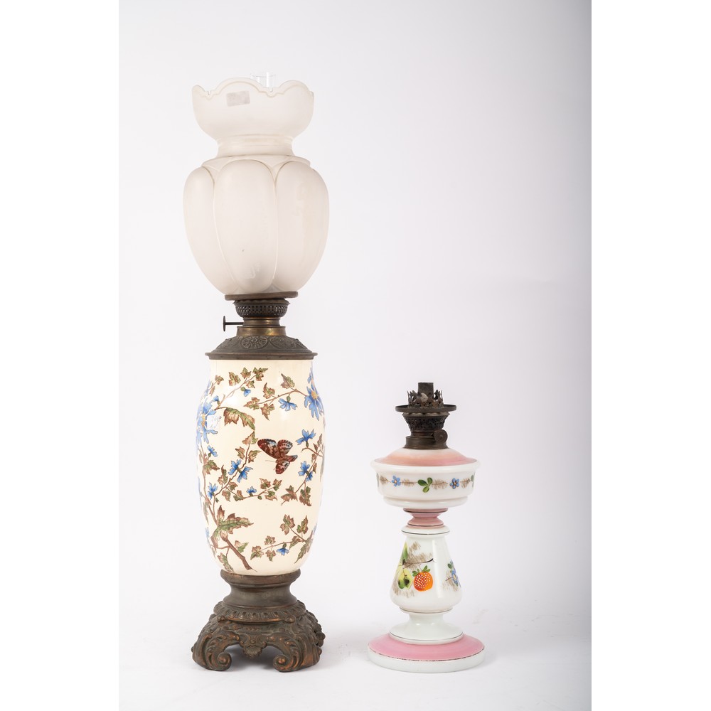 Lume in opaline nei toni del rosa e del bianco con decori floreali e lume a petrolio in porcellana e bronzo con decori a motivi vegetali e floreali (filè)