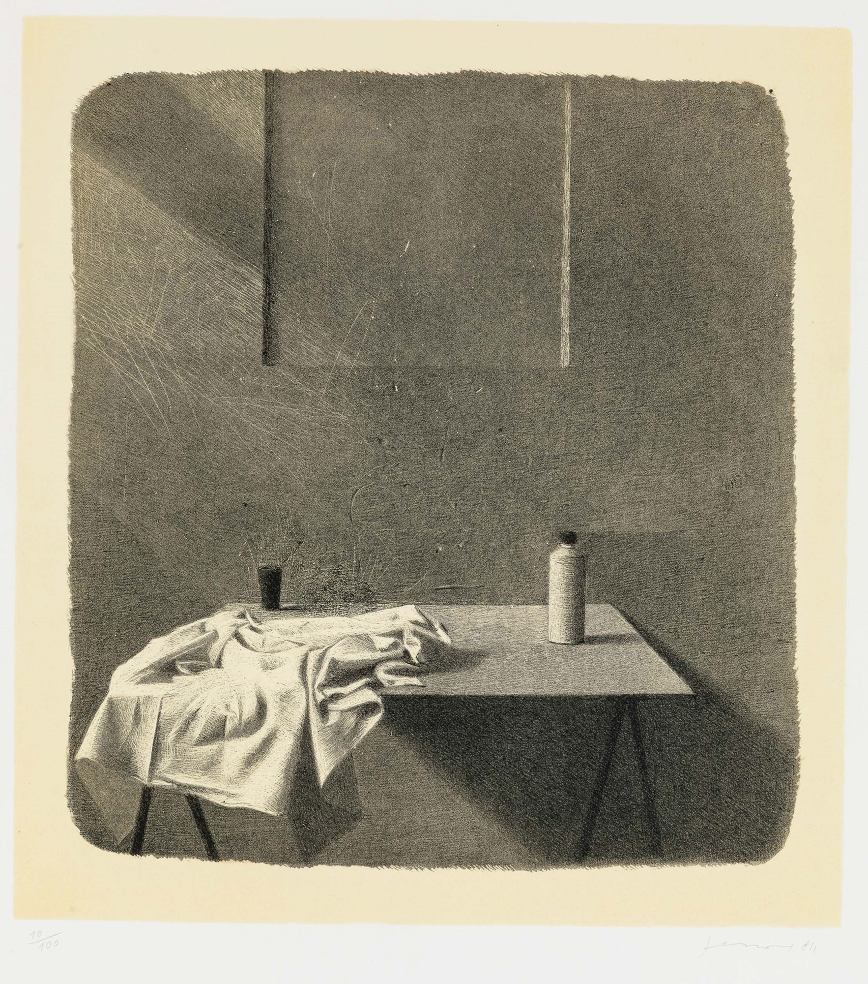 Gianfranco Ferroni, Tavolino con straccio e flacone, 1984
