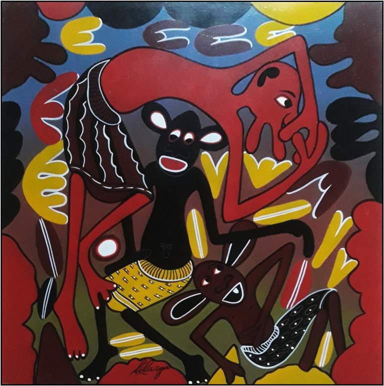 LILANGA GEORGE Kikwetu (TANZANIA) 1934 - Dar es Salaam (TANZANIA) 2005 "Senza titolo" Acrilico su tavola cm 39x39 del 1997. Firmato sul fronte in basso al centro. Opera pubblicata a pag. 104 del catalogo ragionato "Raisonnè" Volume I.