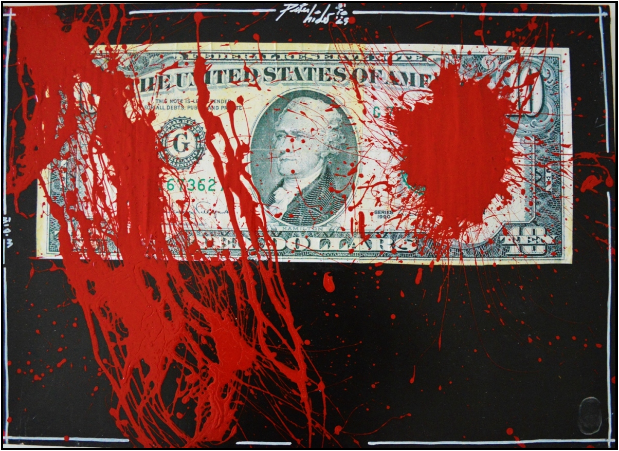 HIDE PETER (FRANCO CRUGNOLA) Tradate (VA) 1965 "Blood Money" Tecnica mista su tela in teca di plexiglass, cm 70x50x4. Opera del 2013, firmata, datata ed intitolata sul retro. Autentica su foto a cura dell'artista. Opera esposta presso il Museo Bodini nel 2015.