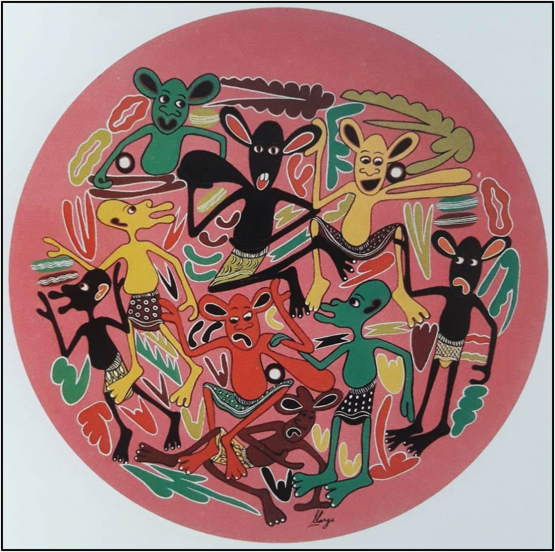 LILANGA GEORGE Kikwetu (TANZANIA) 1934 - Dar es Salaam (TANZANIA) 2005 "Senza titolo" Acrilico su tavola cm 100 di diametro, del 1998. Provenienza "Fabbrica Sarenco Collection", Kenya. Opera pubblicata a pag. 161 del catalogo ragionato "George Lilanga" Volume I.