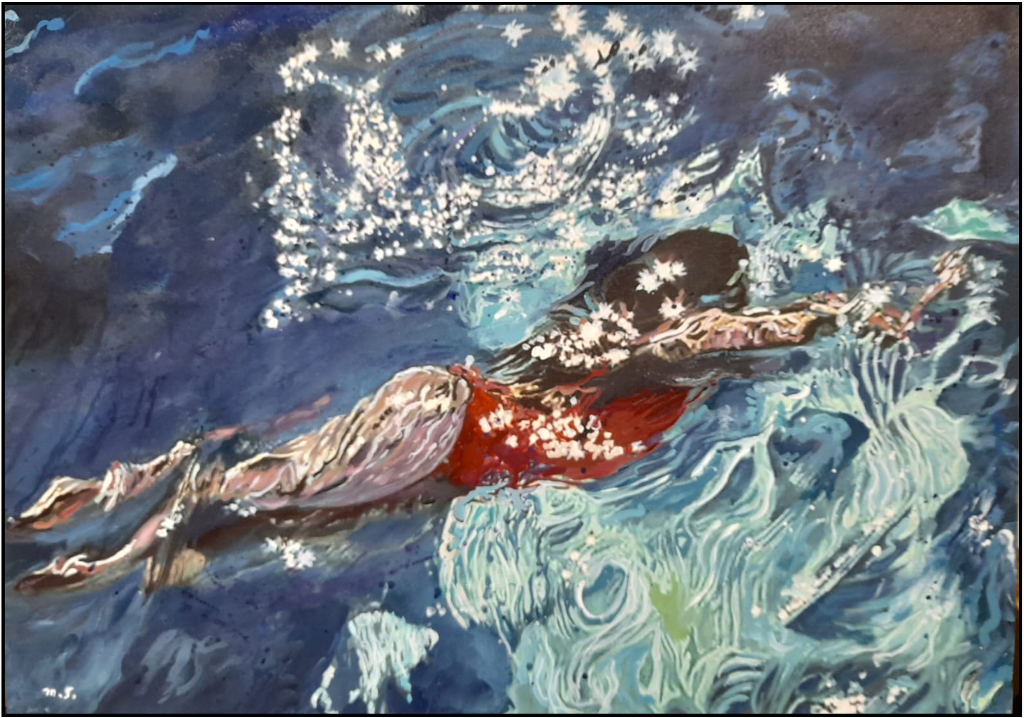 SAUVAGE MAX HAMLET Gallipoli (LE) 1950 "Bagnante sott'acqua" Acrilico su tela cm 69x49 del 2019. Firmato sul fronte in basso a sinistra. Sul retro titolo, data, firma ed etichetta descrittiva a cura dell'artista. Autentica su foto.