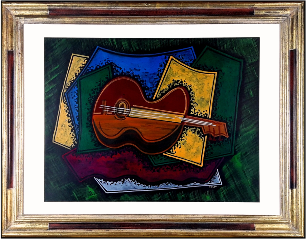 ORIANI PIPPO Torino 1909 - Roma 1972 "Grande chitarra" Encausto su cartone telato cm 65x50 del 1967-68. Sul retro etichetta storica a cura di Giuseppe Oriani con firma autentica dell'artista, ed altra etichetta a cura della Foundation Oriani di G.E.O. Autentica ed archiviazione su foto a cura di Gabriel Henry Oriani, per conto della Oriani Foundation Canada, datata giugno 2014. Opera pubblicata sul Vol. II del Catalogo Generale, così come da autentica.