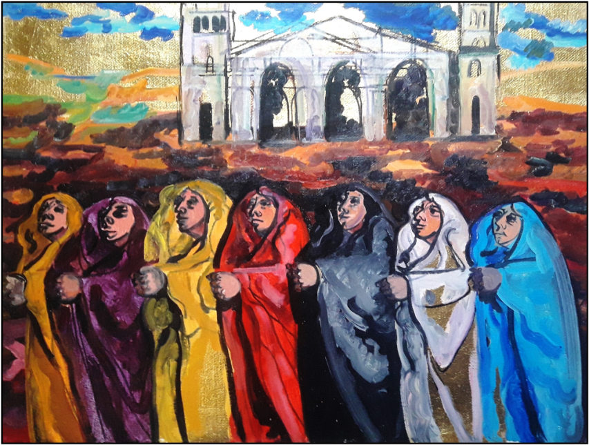 TERRUSO SAVERIO Monreale (PA) 1939 - Milano 2003 "Processione" Olio su tela cm 80x60. Opera registrata presso l'archivio generale delle opere di Terruso Saverio. Certificato di archiviazione su foto a cura dell'archivio e certificato di provenienza a cura della Meeting Art.