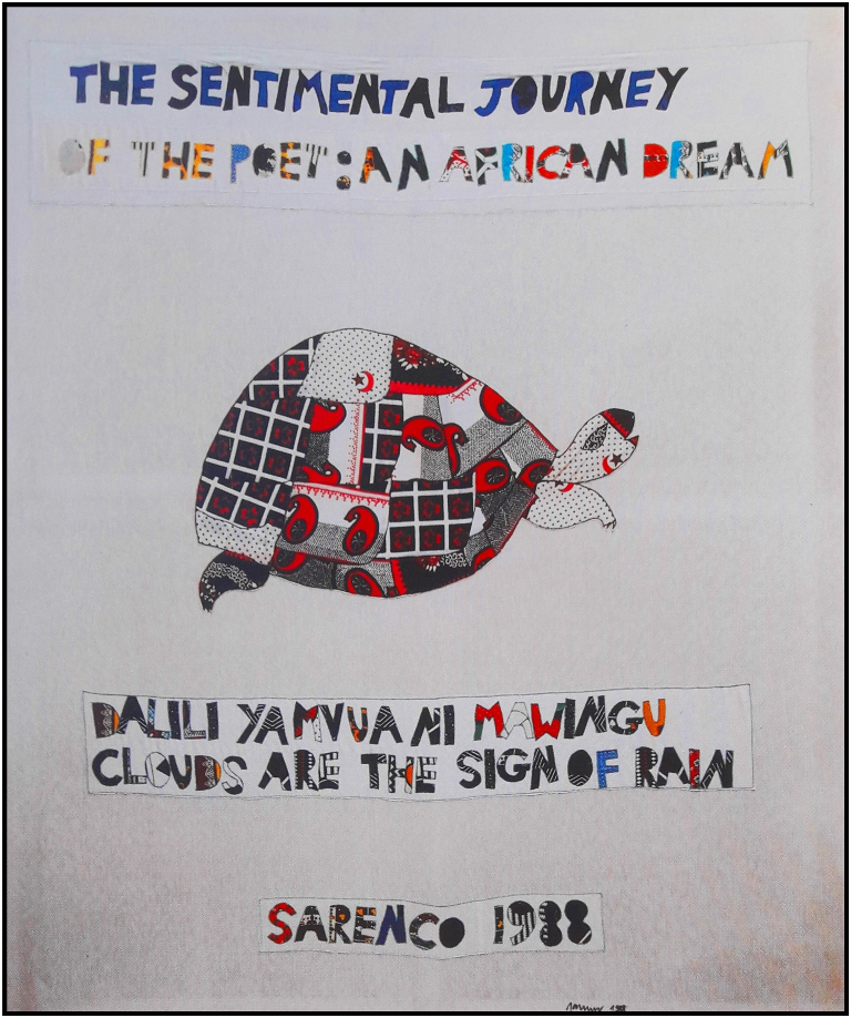 SARENCO (ISAIA MABELLINI) Vobarno (BS) 1945 - Salò (BS) 2017 "The sentimental journey of the poet" Patchwork su tela cm 220x260 del 1988. Opera firmata e datata sul fronte, in basso a destra. Sul retro firma. Opera pubblicata a pag. 156 del catalogo ragionato "Opere di Sarenco" Volume I a cura di Achille Benito Oliva.