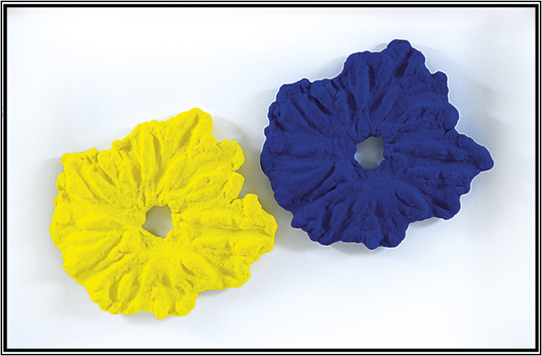 PINELLI PINO Catania 1938 "Pittura G.BL" Pittura su 2 elementi di diametro cm 32 cadauno, applicati su tavola, all'interno di teca in legno di cm 86x56. Firma, titolo, anno e località (Milano) al retro dell'elemento di sinistra, dichiarazione d'autenticità e numero di archivio dell'artista, su foto. Provenienza e pubblicazione sul catalogo di altra casa d'aste.