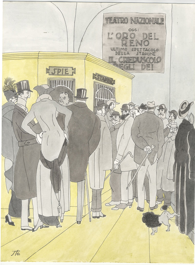 Sergio Tofano (1886-1973). Teatro Nazionale oggi L'oro del Reno ultimo spettacolo della stagione Il crepuscolo degli dei. Acquarello su cartoncino mm. 400x300. Firmato in basso a sinistra "Sto". Il disegno è un rifacimento fedele, eseguito in anni più recenti apportando piccole varianti, di una illustrazione eseguita dall'artista stesso per l'album satirico antitedesco Gli unni...e gli altri di Giannino Antona-Traversi, Milano, Rava, s. d. (1915). Nell'album, illustrato da una schiera di valenti umoristi come Sacchetti, Bonzagni, Dudovich e Ventura, il disegno di Sto era sopratitolato a stampa "Il grande lavoro del Principe von Bülow a Villa Malta" e sottotitolato "Povero Palamidone!". -
