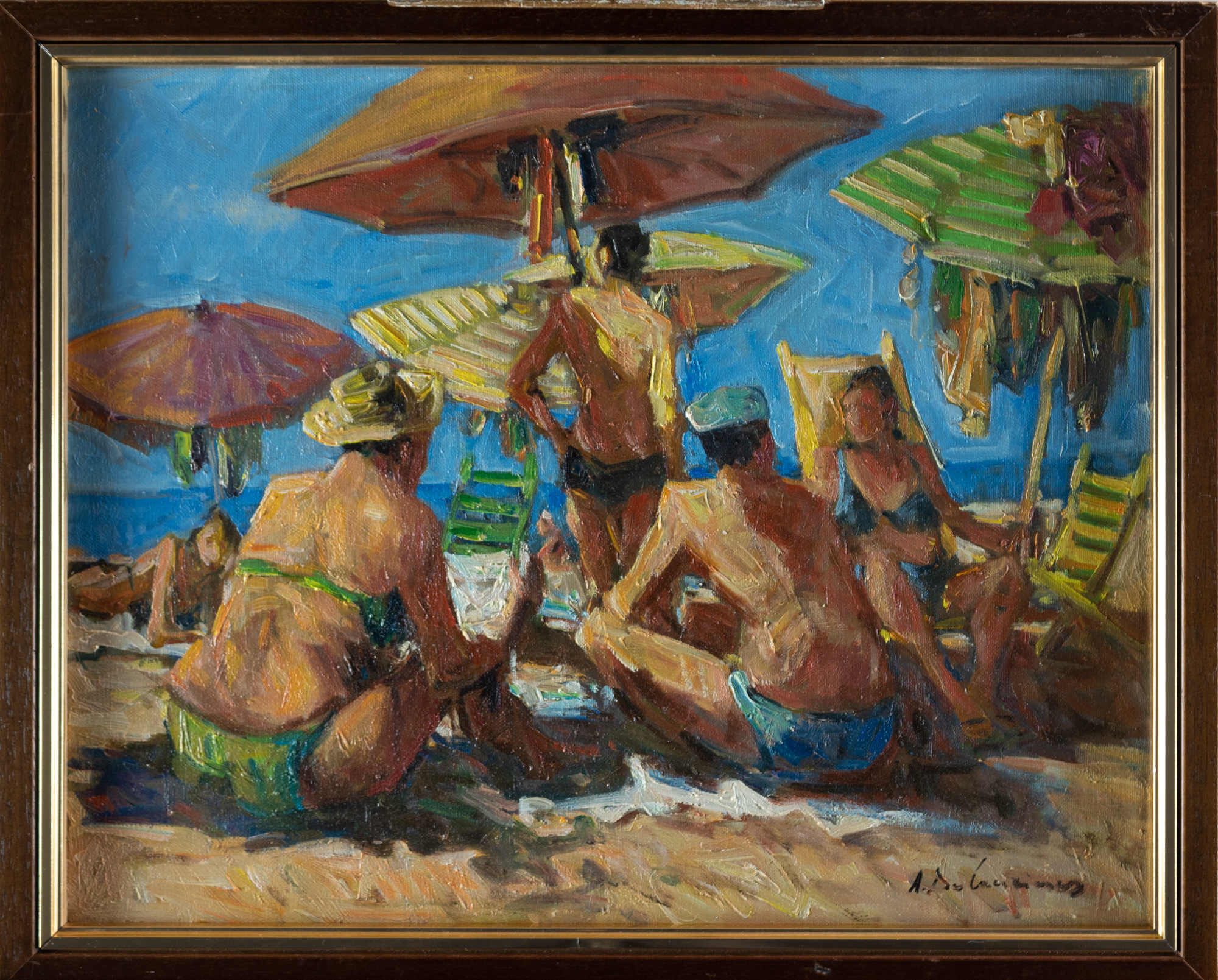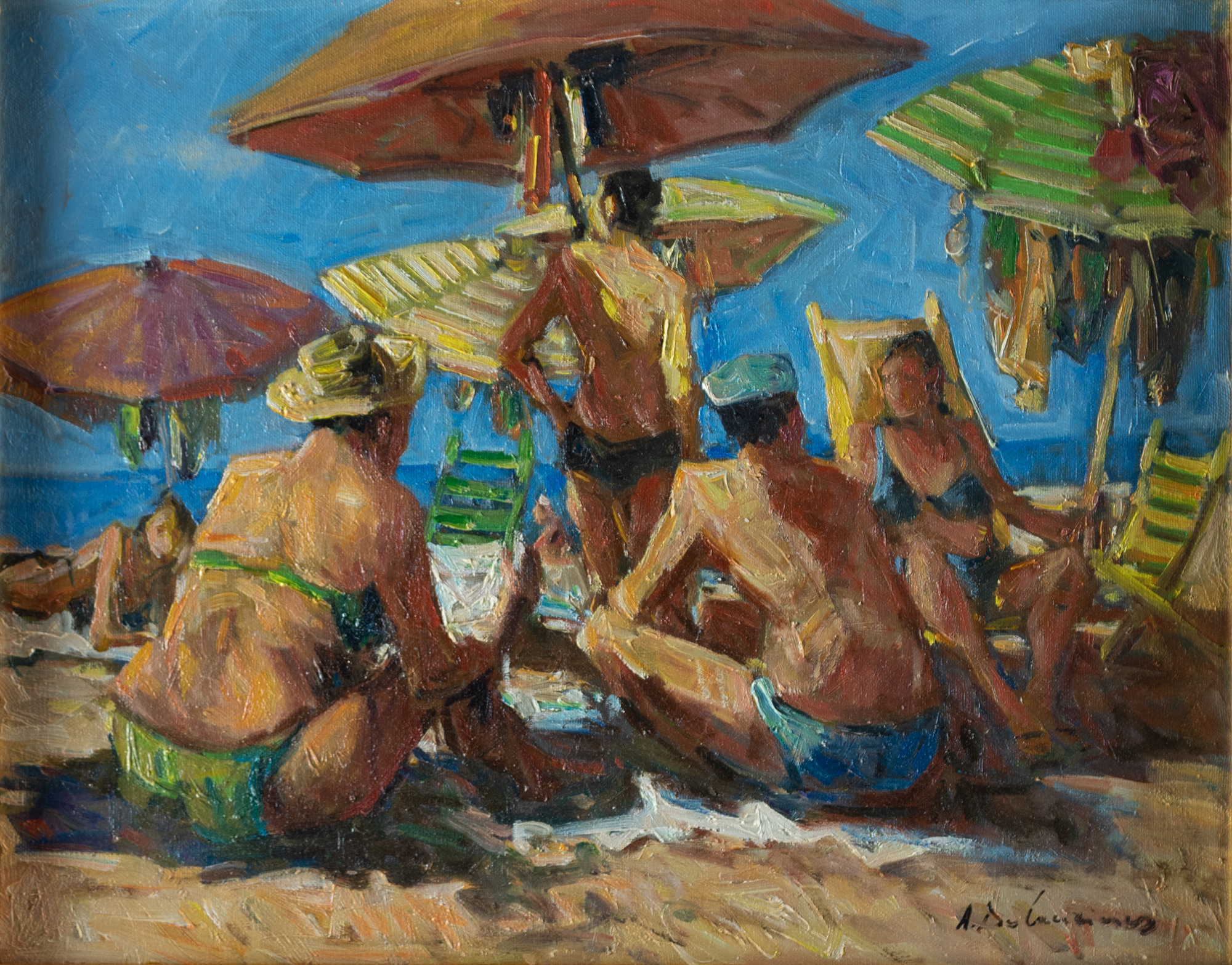 Armando De Lauzieres (Portici 1943), Bagnanti in spiaggia, Olio su tela, 40x50 cm.