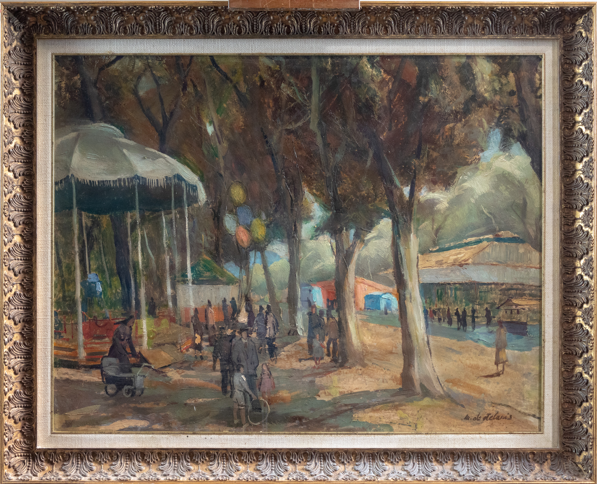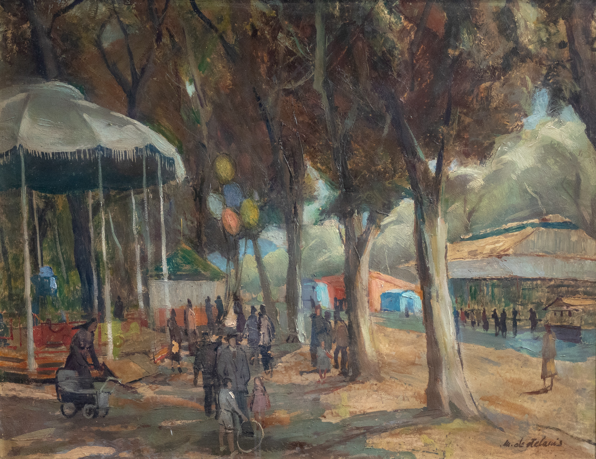 Michele Destefanis (Pozzuoli 1917 - Todi, 2015), Alle giostre, Olio su tavola, 58x75 cm.