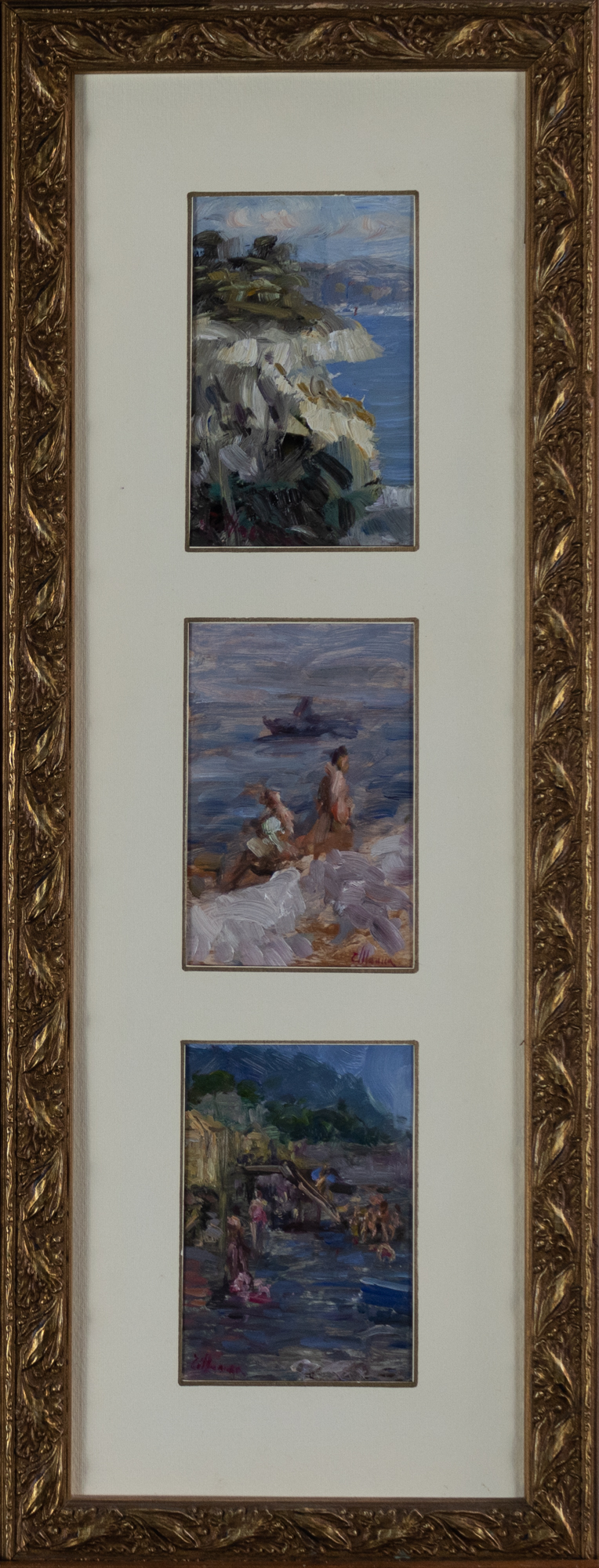 Tonino Manna (Sant' Antimo NA, 1952 - 2022), Trittico con paesaggi, Olio su cartoncino, 15x10 cm x3.