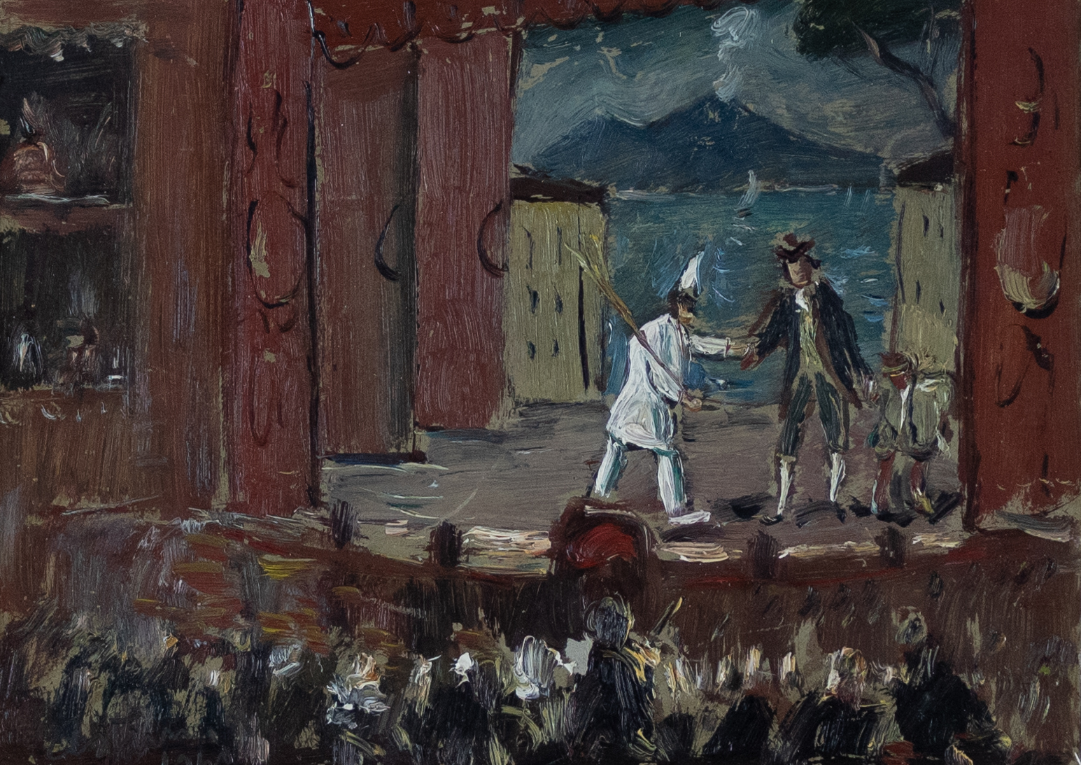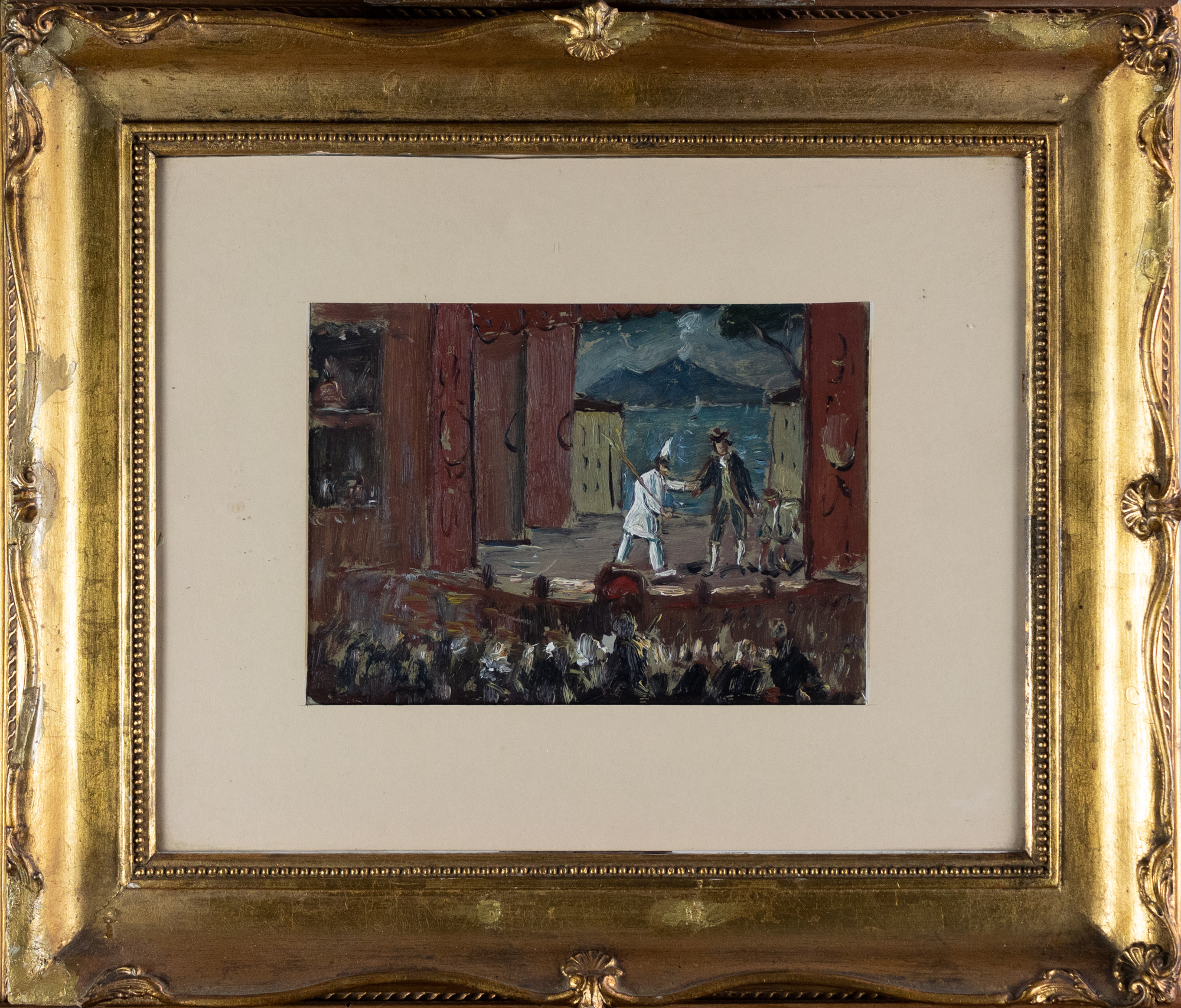 Antonio Asturi (Vico Equense, NA 1904 - 1986), Teatrino del san Carluccio, Olio su cartone, 18x24 cm, Datato 1940.