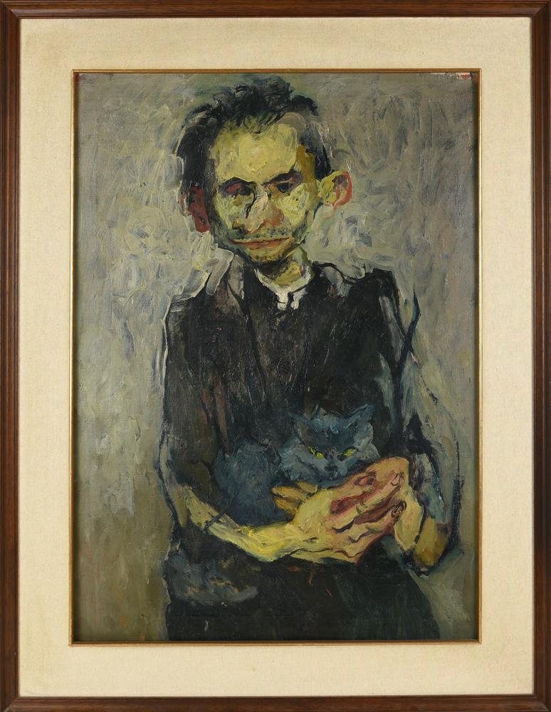 Piero Sadun, (1919 - 1974) DON LUIGI CON GATTO olio su tela, cm 69,5x50 sul...